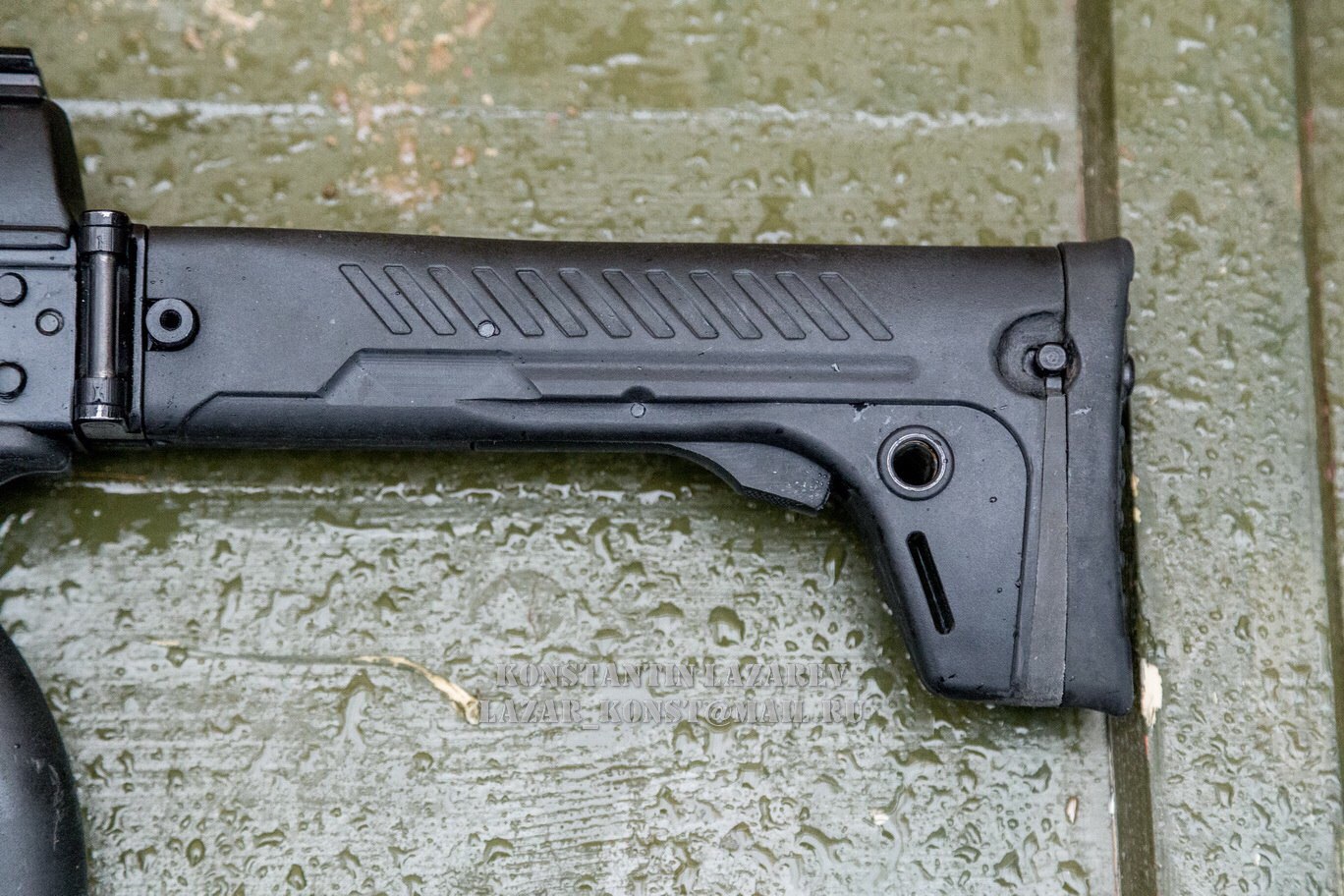 AK-12另一项较大的改变是伸缩式枪托,而且还有4个伸缩档,可以适应不同身高臂长的射手,或穿上厚重防弹衣时可以缩短至舒适的长度。而且枪托的抵肩点处于枪管轴线上,这样就能更容易控制后坐力。另外枪上还有一块可调节高度的贴腮板,这样当使用者装上不同类型的瞄准镜而不是使用机械瞄准具的时候,可以适当地调节贴腮板高度来获得比较舒适的瞄准基线高度。和AK-74一样,AK-12的枪托在不使用时可向左折叠。其实最初公布的样枪图片中的枪托是向右折叠的,但在2012年底时公布的样枪就已经把折叠枢轴改到左侧了,这显然是在试验中俄军士兵反映他们更习惯AK-74M那种向左折叠的设计。
