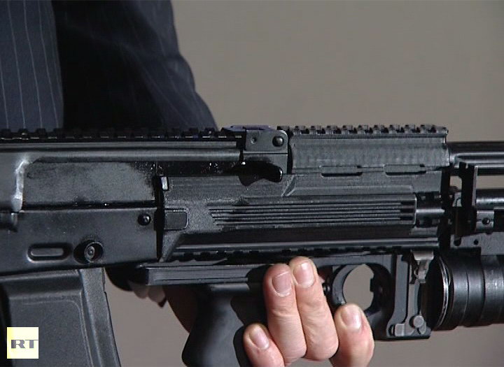 2014年的AK12样枪,可看出机匣盖向前延伸的导轨,及前连接点由横销改为“T”字形的楔入槽