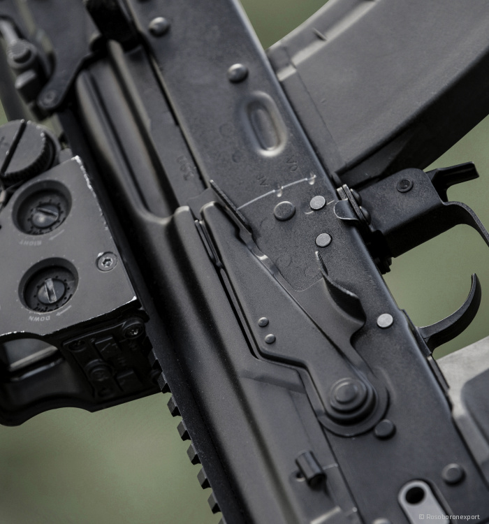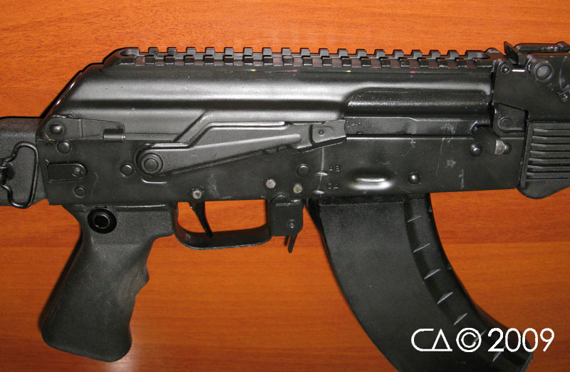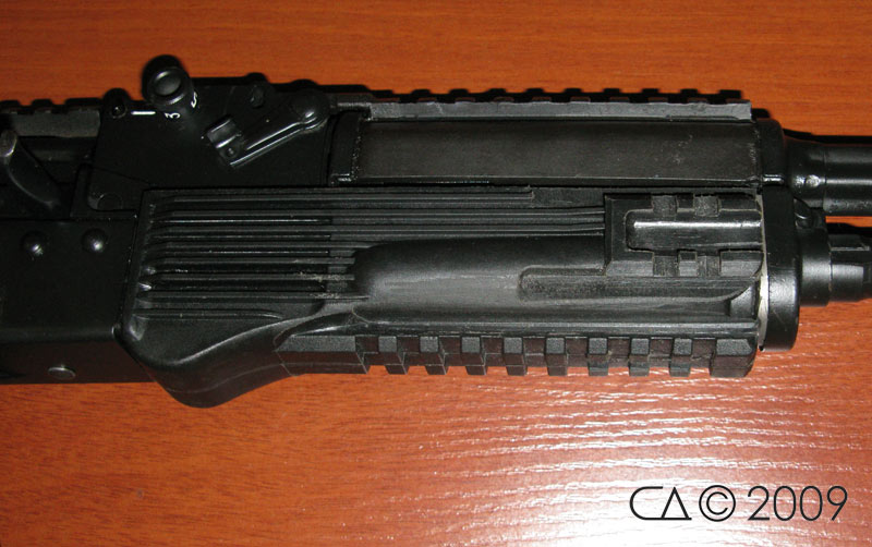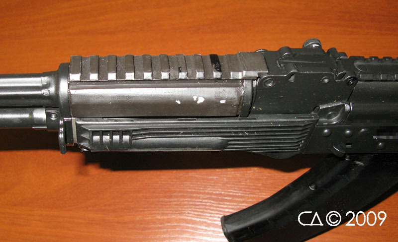 其实在更早的时候,伊孜玛什公司就展出过在护木上整合有皮卡汀尼导轨的AK-100。而在2009年时,伊孜玛什公司又公布了一种在机匣盖上整合有皮卡汀尼导轨的新AK。传统的AK不能在机匣盖上加装瞄准装置,是因为AK的机匣盖材料轻薄而且固定并不牢固,芬兰AK和以色列加利尔的机匣盖是重新设计过,不但厚重而且有4个配合面定位,因此可以在机匣盖上安装照门。而伊孜玛什公司为了能在机匣盖上直接加装光电瞄具,而不是采用传统的机匣左侧式瞄准镜座,在新的机匣盖后端增加了固定装置。使机匣盖不会在射击震动时跳动。
