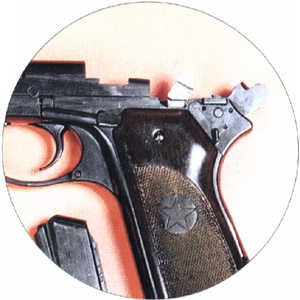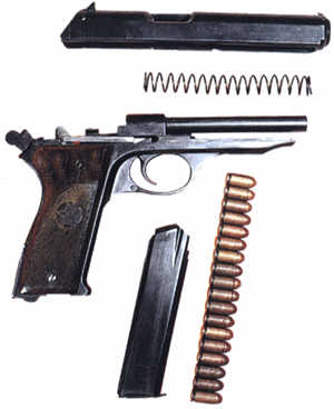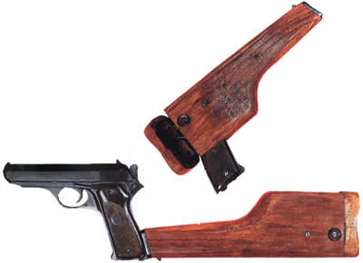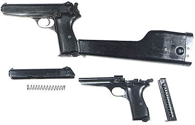 这是一种冲锋 手枪,射击机构有单发和连发的选择,保险机也是快慢机。采用击锤回转式设计,为了简化击发机构以提高可靠性,取消了击锤的双动击发能力。这种手枪使用18发容量的双排弹匣,木制的枪套可以连接在握把底部作为枪托,以提高射击的稳定性。