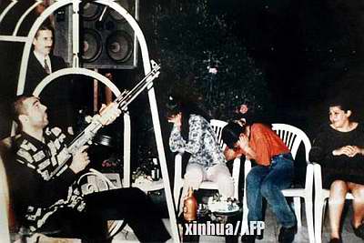 这是萨达姆的儿子乌代在舞会上用Ai-Quds向天鸣枪的新闻图片,由于该枪型采用下翻式折叠枪托,因此经常有人误认此为AKMS。