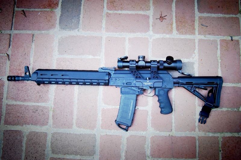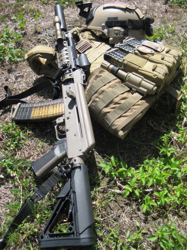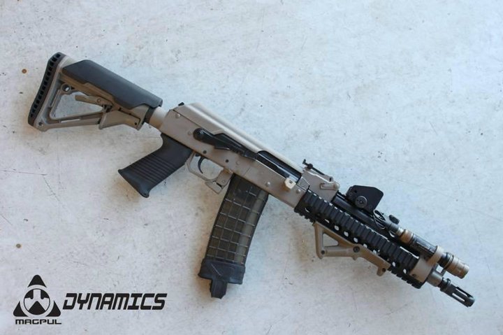 使用了Magpul公司的护木、枪托、弹匣等配件改装过的5.56口径AK