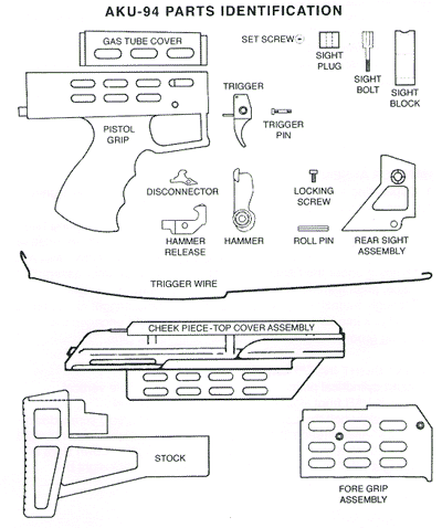 AKU-94是一套可以把各种AK步枪改装成无托结构步枪的改装套件,同时厂家提供有改装手册,可以让客户自己进行改装。能够改装的包括了AK-47、AKM、AK-74、AK100系列以及其他国家生产的AK步枪,可以说绝大部分的AK都能够用这套改装套件改成无托步枪。这些套件大部分都是用重量轻的聚合物材料制造,因此改装后的重量也很轻。不过据一些人的试验,发现改装后好像玩具一样让人觉得很不放心,而且射击时的感觉非常不舒服。是一个富有想像力但不太实用的改装。