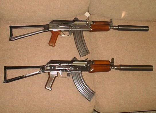 这是网友丁丁的AKS-74U,从这个中国特色的冲压机匣可以看出原产地,下面那些不同形式的“AKS-74U”也是用中国生产的AK改装的,从弹匣可以判断出口径是5.56mm还是7.62mm。