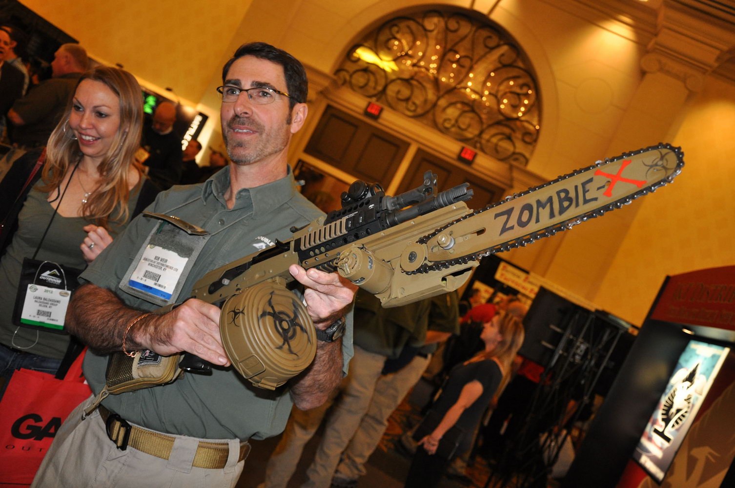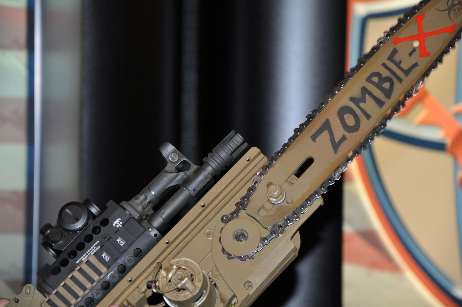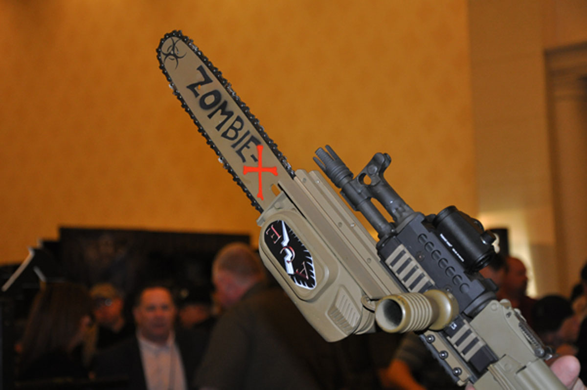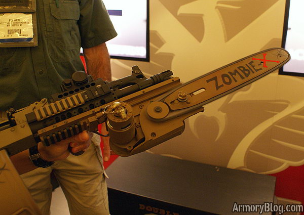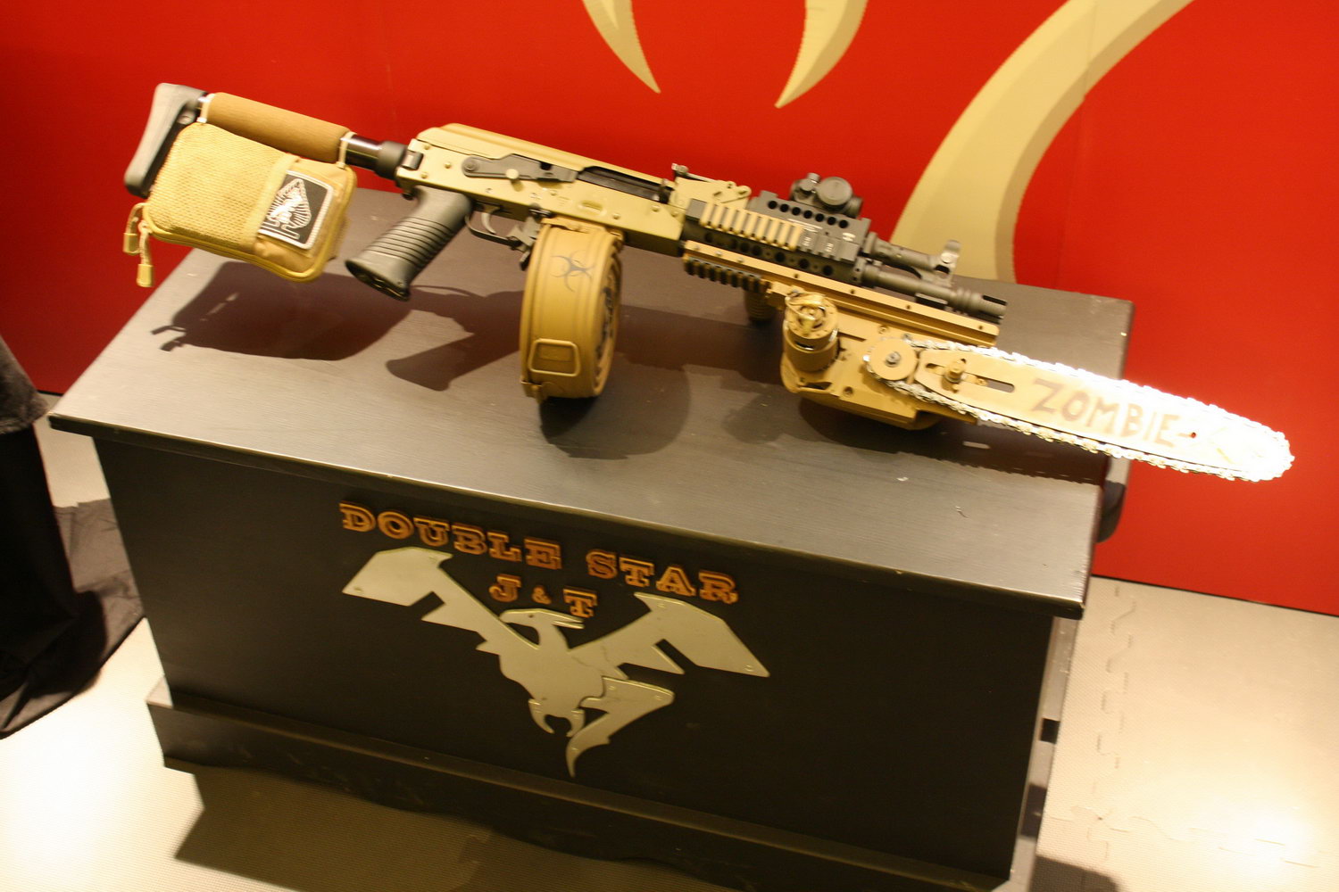 从2011开始,已经有轻武器厂商试水反丧尸武器,2012年的SHOT SHOW上,更是涌现出一大批反反丧尸武器,比如这种称为ZOMBIE-X的反丧尸AK,除了把AK加上导轨护木外,还挂上了一把电锯,电池则放在枪托上挂着的袋子里。