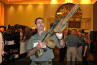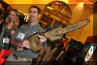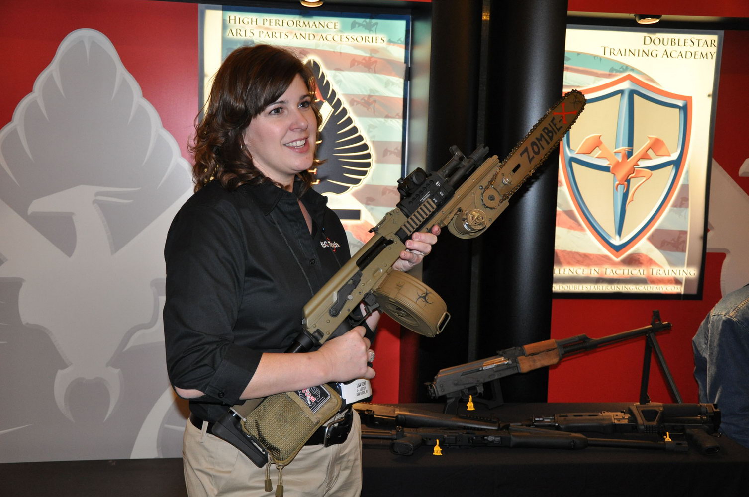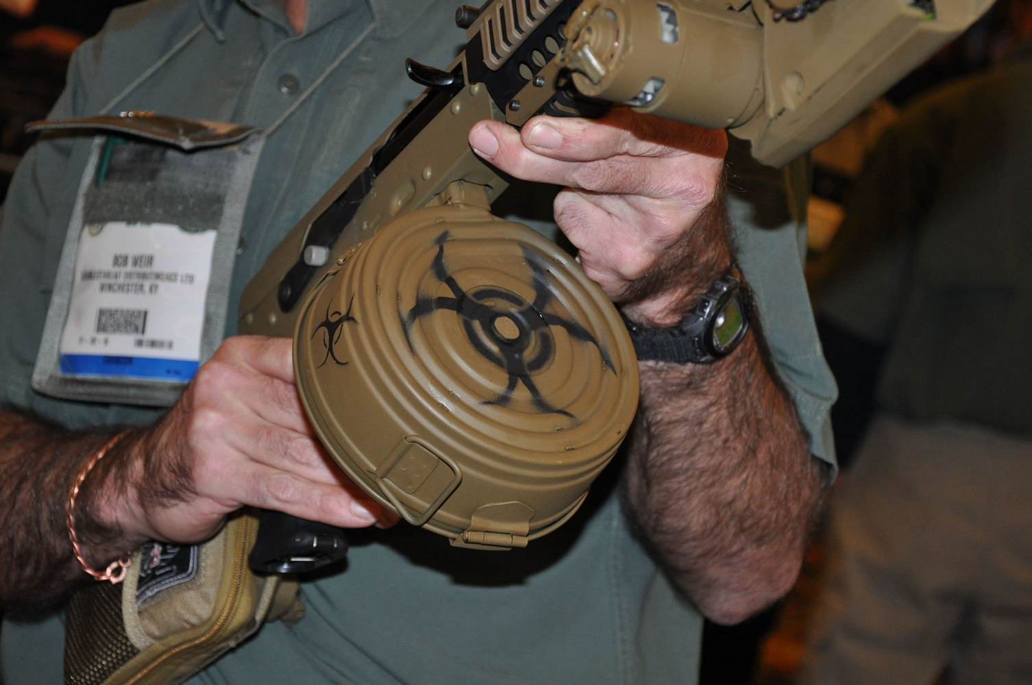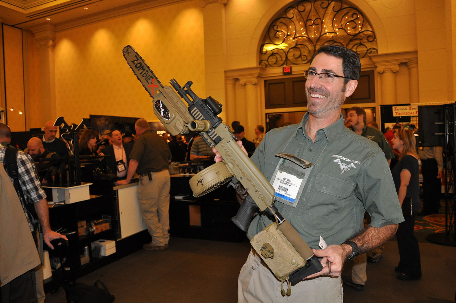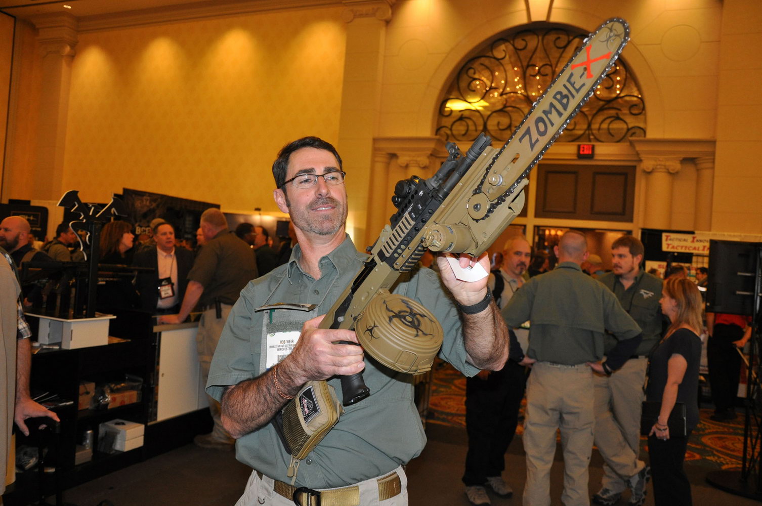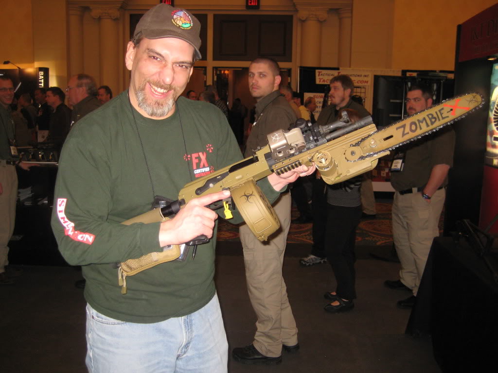 从2011开始,已经有轻武器厂商试水反丧尸武器,2012年的SHOT SHOW上,更是涌现出一大批反反丧尸武器,比如这种称为ZOMBIE-X的反丧尸AK,除了把AK加上导轨护木外,还挂上了一把电锯,电池则放在枪托上挂着的袋子里。