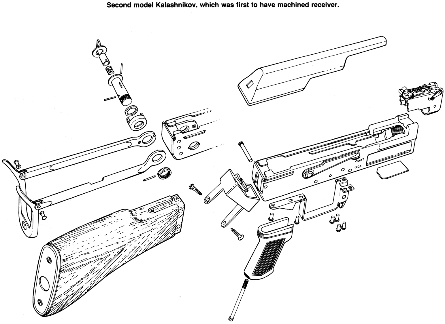参考M1伽兰德的枪机,从AK-46到AK-47第1型的抛壳挺都是在枪机上的,在AK-47第2型开始才才移到了机匣上