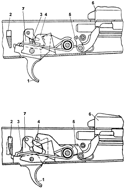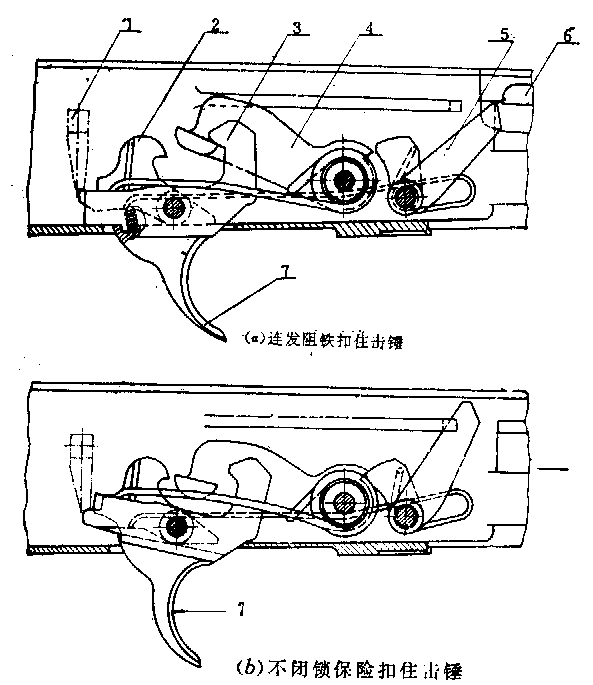 AKM的击发机构:①扳机/击发阻铁 ②保险/快慢机 ③单发阻铁 ④击锺 ⑤不到位保险 ⑥枪机框 ⑦击锤延迟体