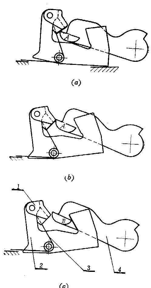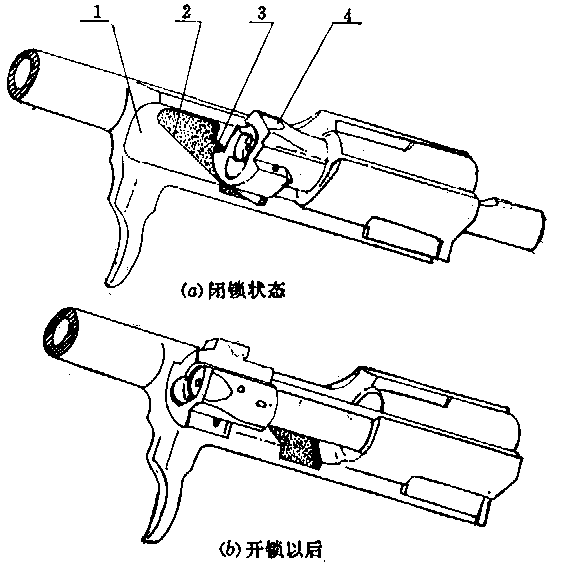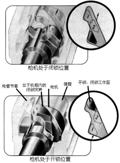 AK枪机组:①机框;②机框上的开锁工作面;③闭锁工作面;④枪机