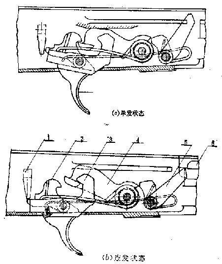 AK47的击发机构:①快慢机;②单发阻铁;③连发阻铁(与扳机同一零件);④击锤;⑤不闭锁保险;⑥机框