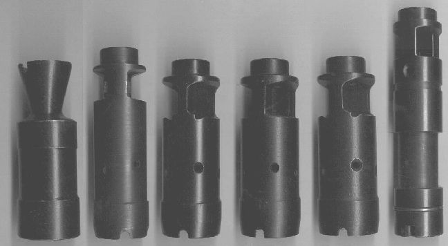 各种AK的枪口装置,从左至右:(1)俄罗斯AKS-74U枪口消焰器;(2)罗马尼亚AK-74枪口制退器;(3)前东德MPiAK-74N枪口制退器;(4)保加利亚AK-74枪口制退器(与俄罗斯后期的AK-74M/AK-100相似);(5)俄罗斯AK-74枪口制退器;(6)波兰KbK wz.88枪口制退/枪榴弹发射器。