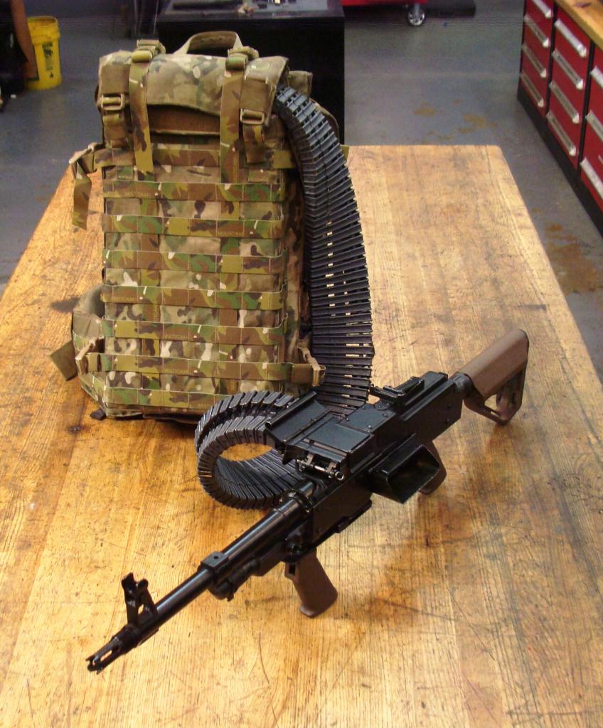 一个俄国枪械爱好者参照SRVV公司的设计,为PKM自制的大容量背负式弹箱,据说可容纳450发弹链,弹链和弹箱一起共重15.1公斤