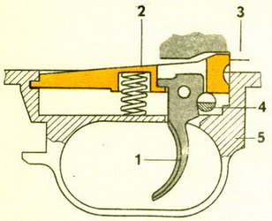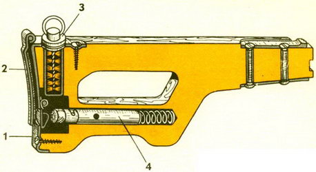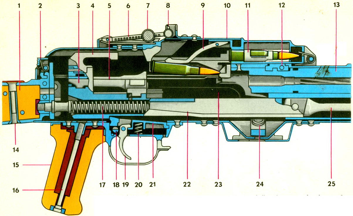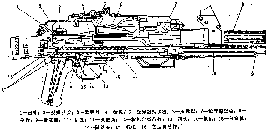 扳机座固定机匣下方,包括扳机护圈。扳机装置与RPD非常相似,也非常简单,而且也是开膛待击。放置式的保险机柄位于扳机座的左边,只有二个位置:保险和全自动,并没有提供半自动射击能力,毕竟对于通用机枪来说也用不上半自动射击。