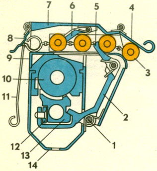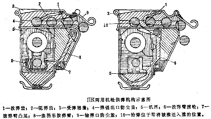PK系列的装填过程如下:弹链从PK右侧进入拨弹滑板,取弹机把枪弹从链节后方拉出,当发射后机框开始后座时,取弹器再从弹链中拉出下一发枪弹,机框运动过程中驱动拨链器把链节向左拉,在枪弹向后运动大约9cm时被会上受弹机盖上的阻弹齿阻止,然后被压弹挺推向拨弹滑板上的拨弹齿,在此前一个抛壳机构会把空弹壳从机匣左侧的抛壳口排出,机框继续后座约4cm,当开始向前运动时,枪机把一发新弹推向弹膛,而机框运动时使拨链器向右移动,顶盖上的一个阻链器会防止弹链下滑。