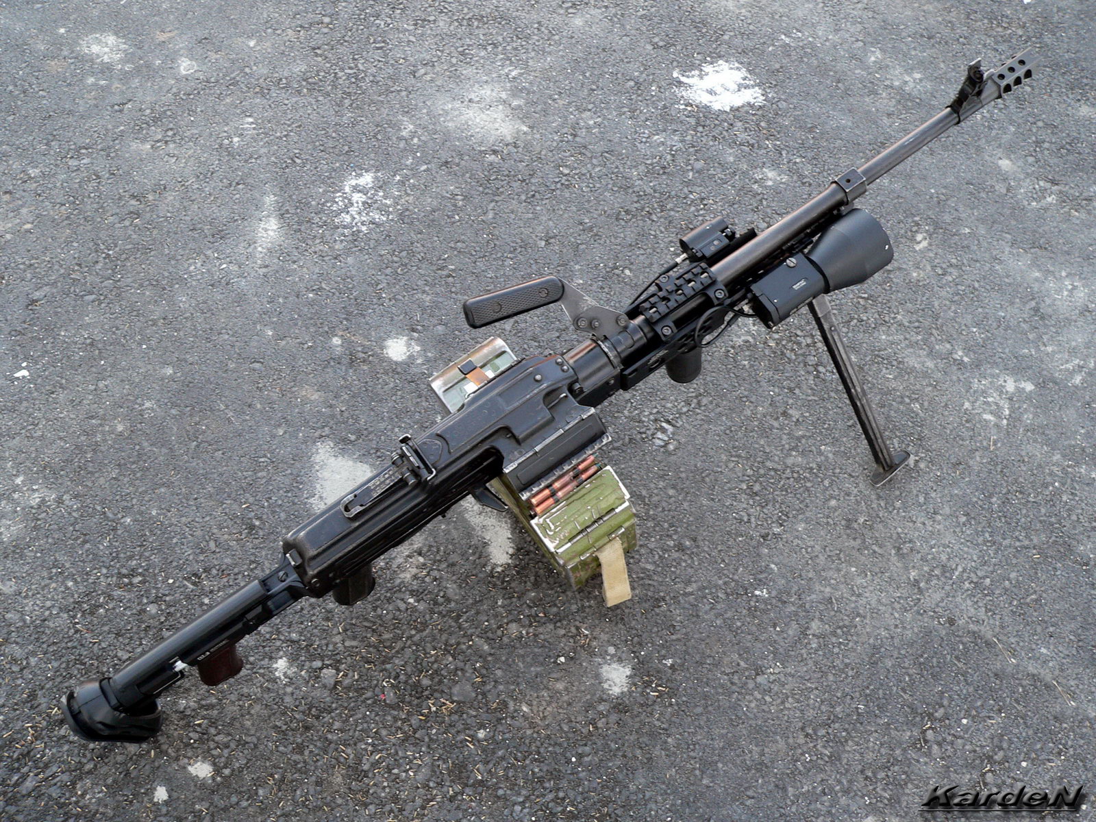 在8年后,卡拉什尼科夫在1969年推出一种PK的改进型,称为PKM。PKM很容易就识别出来,它的枪管较轻,没有凹槽,枪托底板上有翻转式的支肩板。PK/PKM系列有四种型号: