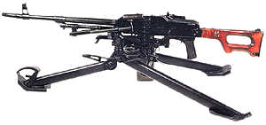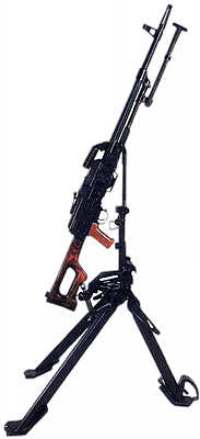 把基本型PK安装在三脚架上就成为重机枪状态的PKS(Pulemyot Kalashnikova Stankoviy,俄文ПКС),这种脚架的方向射界为在平射状态时为±30°,高射状态时为360°,高低射界平射状态为10°~+20°, 高射状态为+72°,火线高从325~605mm可调。空枪连脚架重16.7 kg。