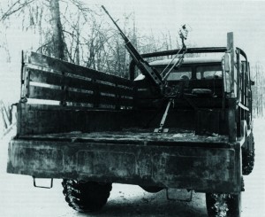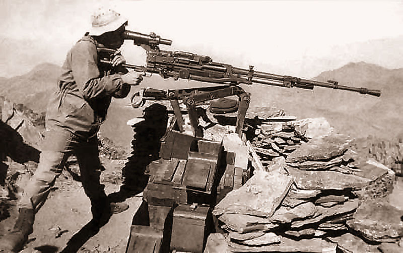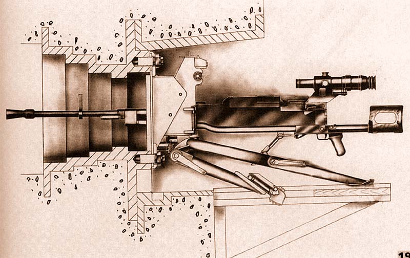 6U6坐式三脚架可以折叠起来拉近火线高与射手瞄准线的高度差,但射手只能用不舒服的跪姿,如下图