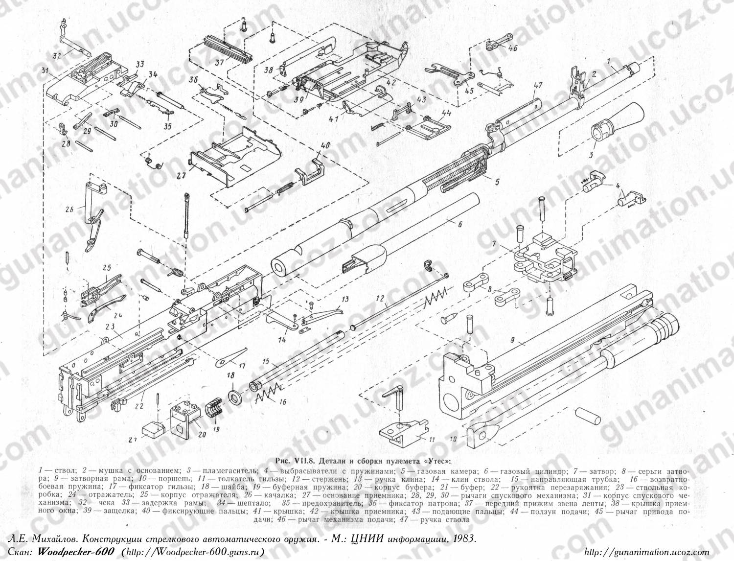 活塞与活塞筒的设置也与同类武器不同。一般的导气式武器是在机框前端设置活塞,在导气箍后面设置活塞筒。而NSV则相反,在机框前端设置活塞筒,导气箍后面设置活塞,活塞尾部装有调节器,可调节进入导气装置的火药燃气量。