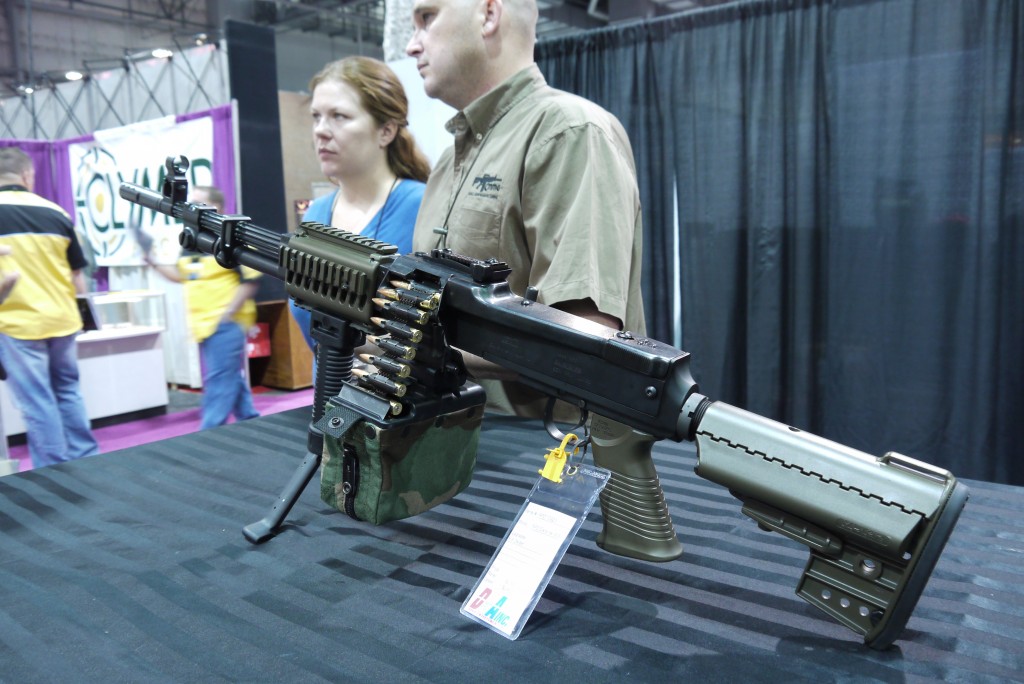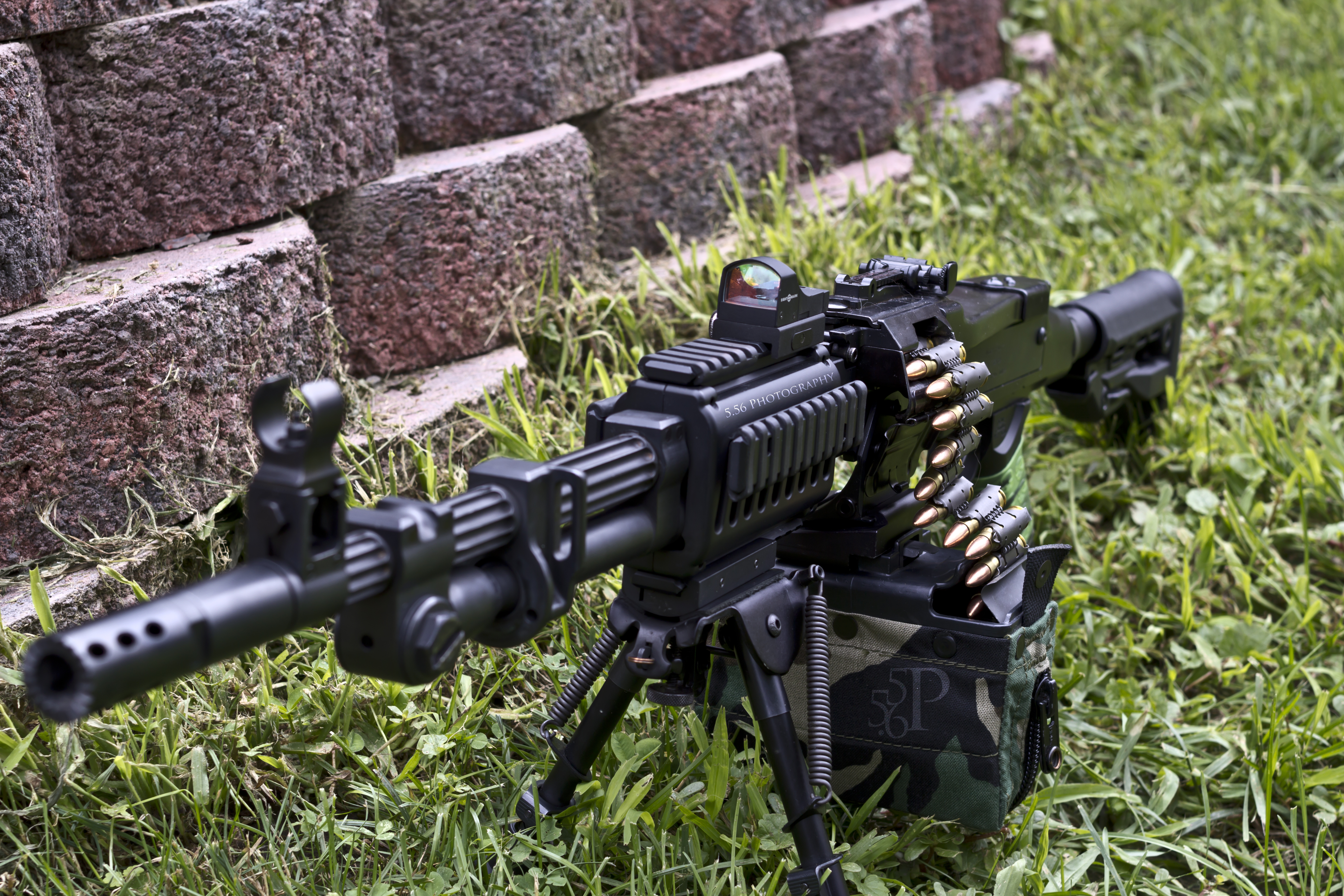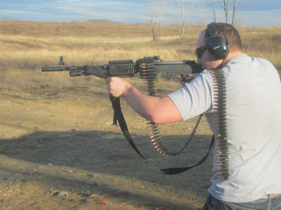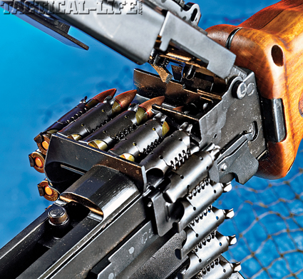 射击前,将拉机柄向后拉,使枪成待发状态(有些型号的枪上的机柄是折叠式的,不随机框往复运动,故拉到后方以后,必须再送回前方)。向前推受弹器盖(即机匣盖)卡笋,然后向上提就可以打开受弹器盖。从弹链盒内抽出弹链,将弹链导片插入受弹器座的输弹口并向右拉到位,即可发射。