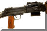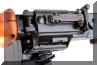 扣压扳机后,扳机前端带动击发阻铁向下,击发阻铁与机框解脱。机框在复进簧力的作用下,向前复进。机框上击铁前部的宽大部分顶在枪机闭锁卡铁的定型凸笋上,使整个枪机也随之向前,枪机的推弹凸笋将弹链上的首发枪弹送入弹膛。