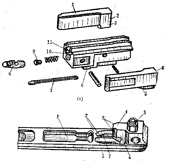 RPD的枪机(a):1-闭锁片;2-闭锁斜面,3-定型凸笋;4-闭锁支承面;5-开锁斜面;6-下突出部;7-击针;8-拉壳钩;9-顶销;10-弹底窝;11一推弹凸笋。