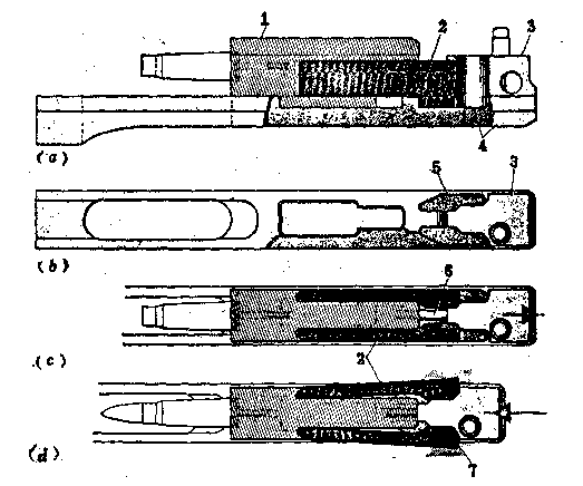 RPD轻机枪闭锁机构动作示意图:1-枪机;2-闭锁片;3-击铁;4-机框;5-开锁定型槽;6-击针;7-机匣上的闭锁卡槽