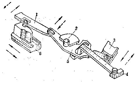 ![]() RPD机枪输弹动作示意图:1-大拨弹杆;2-受弹器盖;3-拨弹滑板;4-受弹器框;5-小拨弹杆;6-机框。 |