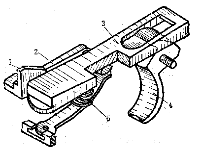 ![]() RPD的击发和发射机构:1-限制凸笋;2-保险机;3-阻铁;4-扳机;5-阻铁簧。 |
