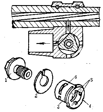 RPD轻机枪的气体调节器:1-紧定螺栓;2-弹性垫圈;3-调节器气塞;4-定位销缺口;5-扳手槽,6-导气槽