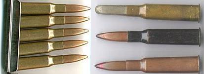 7.62x54mm R枪弹,左边是装在桥夹上的枪弹,右边从上到下为:圆头形的M1891枪弹,钢壳M1908枪弹,铜壳M1908枪弹