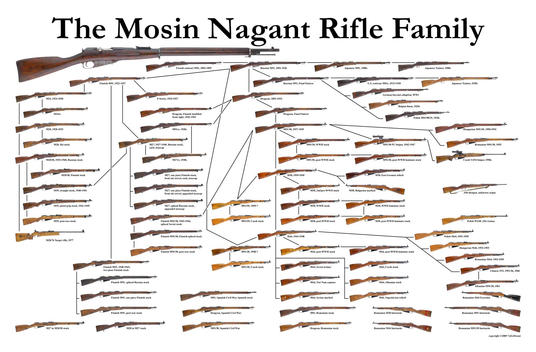 多种型号的莫辛-纳甘步枪作为俄国军队和苏联红军的制式武器,服役期长达60年,并被中国、芬兰、匈牙利、波兰、朝鲜和其他一些国家使用。该枪在二十世纪几乎每一场战争中都能看得到:一战、苏联内战、二战、朝鲜、越南、阿富汗、格林纳达。