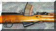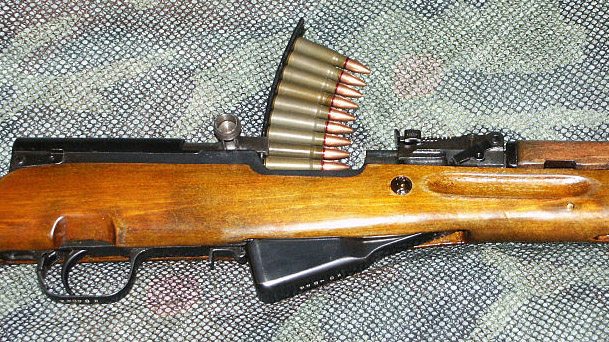 SKS采用10发容量的固定弹仓供弹。装填时,枪机拉开,用一个10发桥夹从机匣顶部的抛壳口把枪弹压入弹仓。当射光弹仓后,枪机会自动挂机,方便重新装填。在弹仓底盖后面有一个卡扣,如果需要把弹仓清空,可把底盖翻开,把枪弹从底部倒出来。