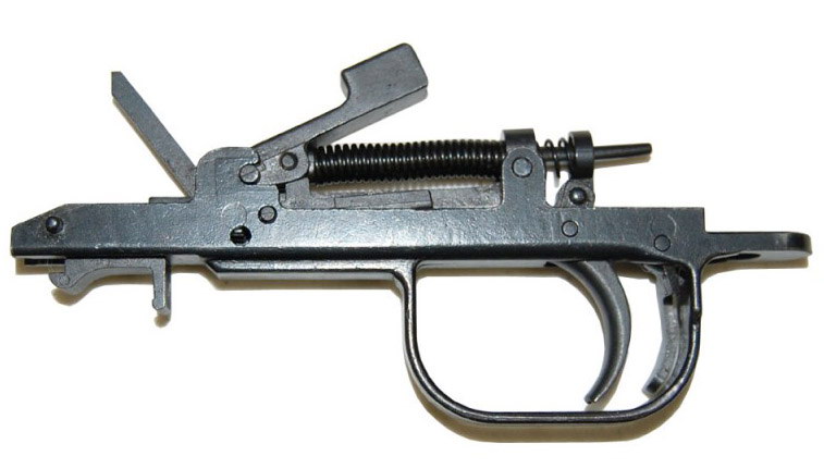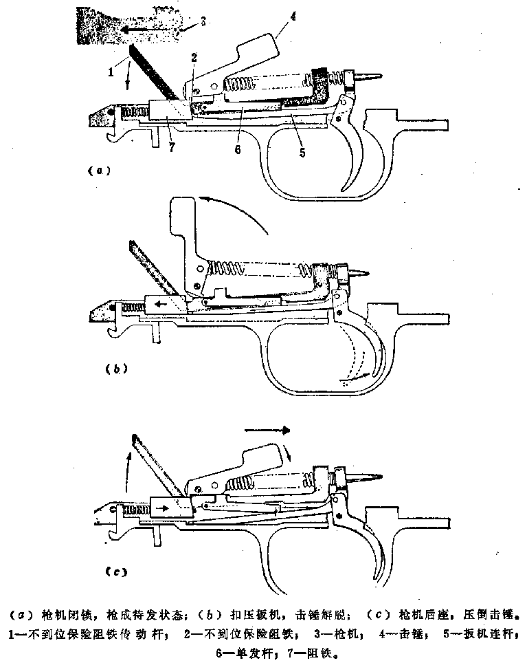 在正常情况下,击锤底部的弧形凸起可起单发杆的作用。但长期使用后,由于传动零件的磨损,击锤向前回转时不能使扳机连杆与阻铁脱离,因此很可能出现“连发”。单发杆的作用是在枪机后座压倒击锤的同时将扳机连杆向下压,解脱阻铁,使之扣住击锤,防止出现“连发”。