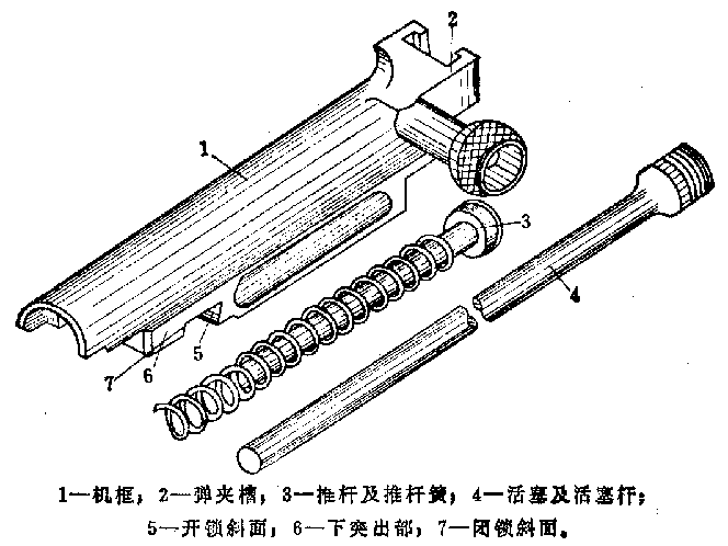 开锁后,机框带动枪机一起后座。到后座行程为20毫米时,推杆受阻,并在推杆簧作用下复进至前方位置,而机框则带着枪机继续后座,抽壳并抛壳。