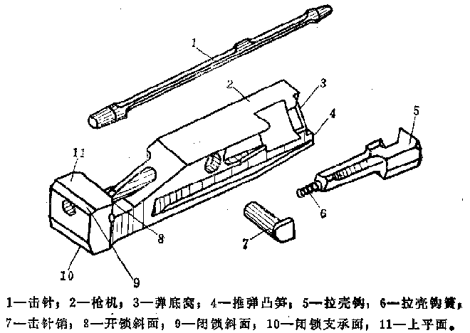 枪弹入膛、枪机闭锁后,击锤呈待发状态。扣压扳机,带动扳机连杆,进而推阻铁向前,使阻铁与击锤解脱。击锤在簧力作用下向前猛转,打击击针,枪弹击发。在击锤向前回转的同时,其上的弧形凸起下压不到位保险,后者又下压扳机连杆前端,使之与阻铁脱离。阻铁在簧力作用下恢复原先位置。