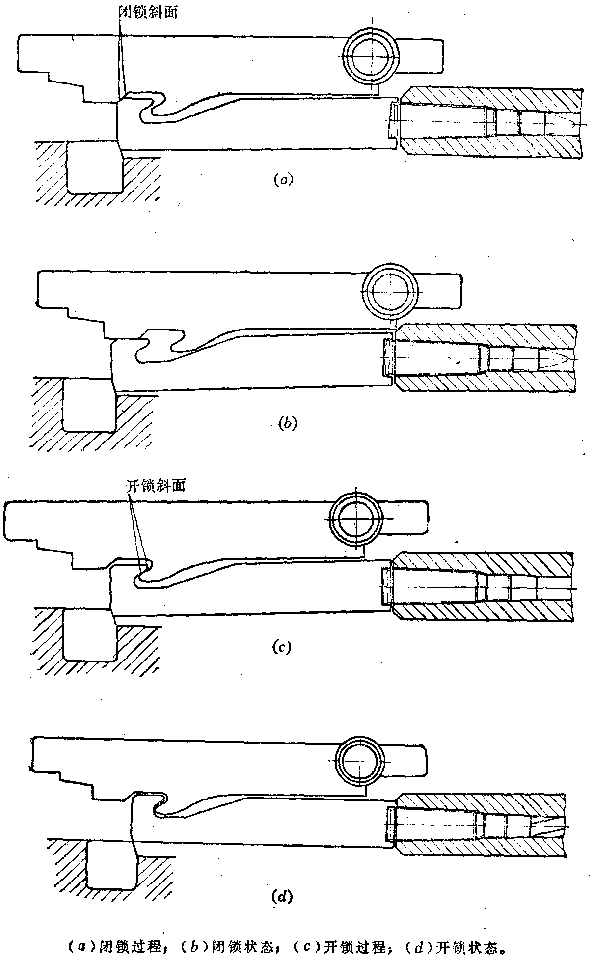 机框先走完8mm自由后座行程。随后,机框的开锁斜面与枪机上的开锁斜面贴合,使枪机同时向后向上运动,最后将枪机尾端钩起,与机匣上的闭锁支承面脱离而完成开锁。
