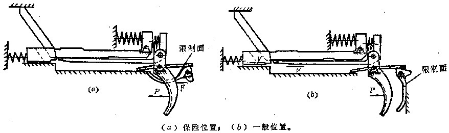 在枪机未确实闭锁前,不到位保险阻铁控制扳机连杆在上方位置,使其对准发射机座上的导棱。此时便扣不动扳机,不能击发;形成不到位保险。另外,不到位保险阻铁中部有一凸起,当枪机未确实闭锁时,不到位保险阻铁处于上方位置,该凸起与击锤卡槽扣合,使击锤不能向前回转。此时,即便扳机连杆对正阻铁,扣压扳机也不能击发,因此,也形成了不到位保险。