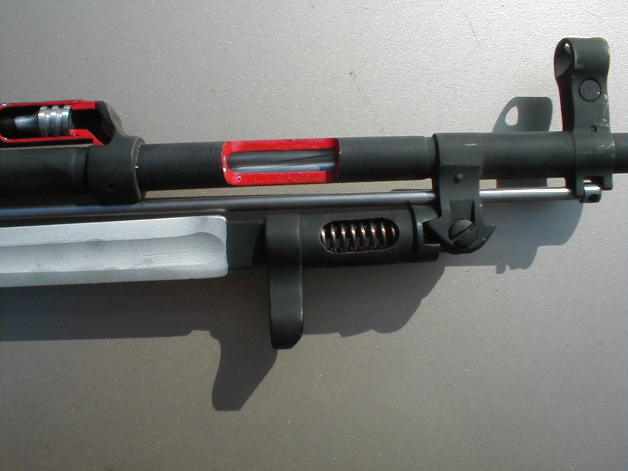 枪弹击发后,当弹头经过枪管上的导气孔后,一部分火药气体便由导气孔进入气室并冲击活塞,通过推杆带动机框一起后座。推杆簧和复进簧被压缩。