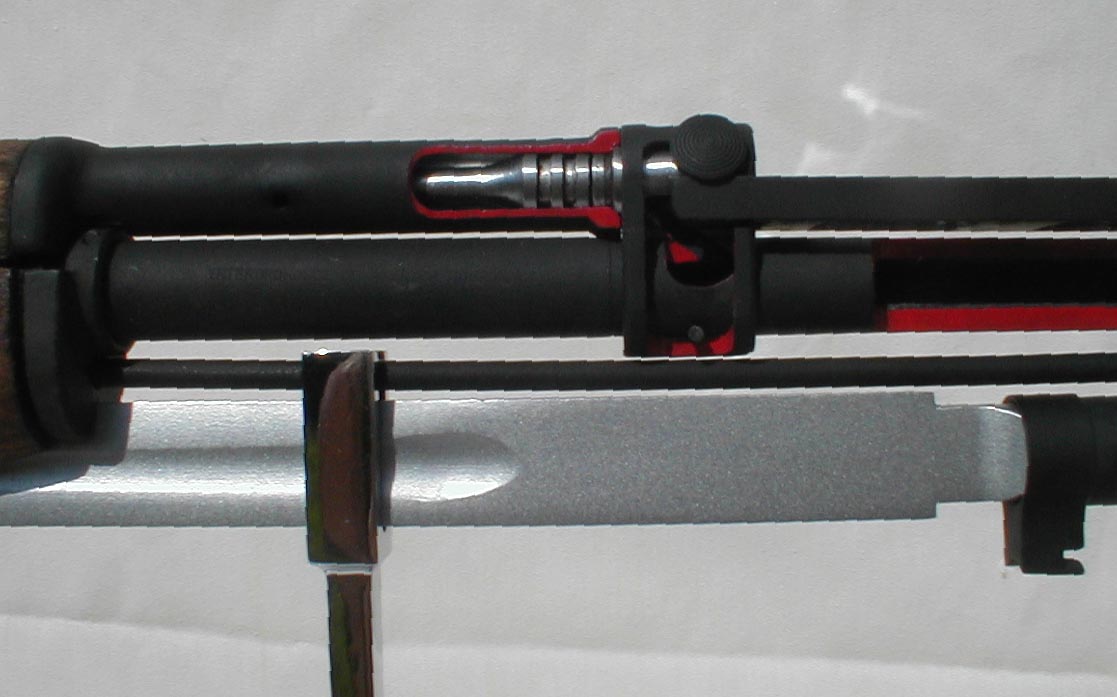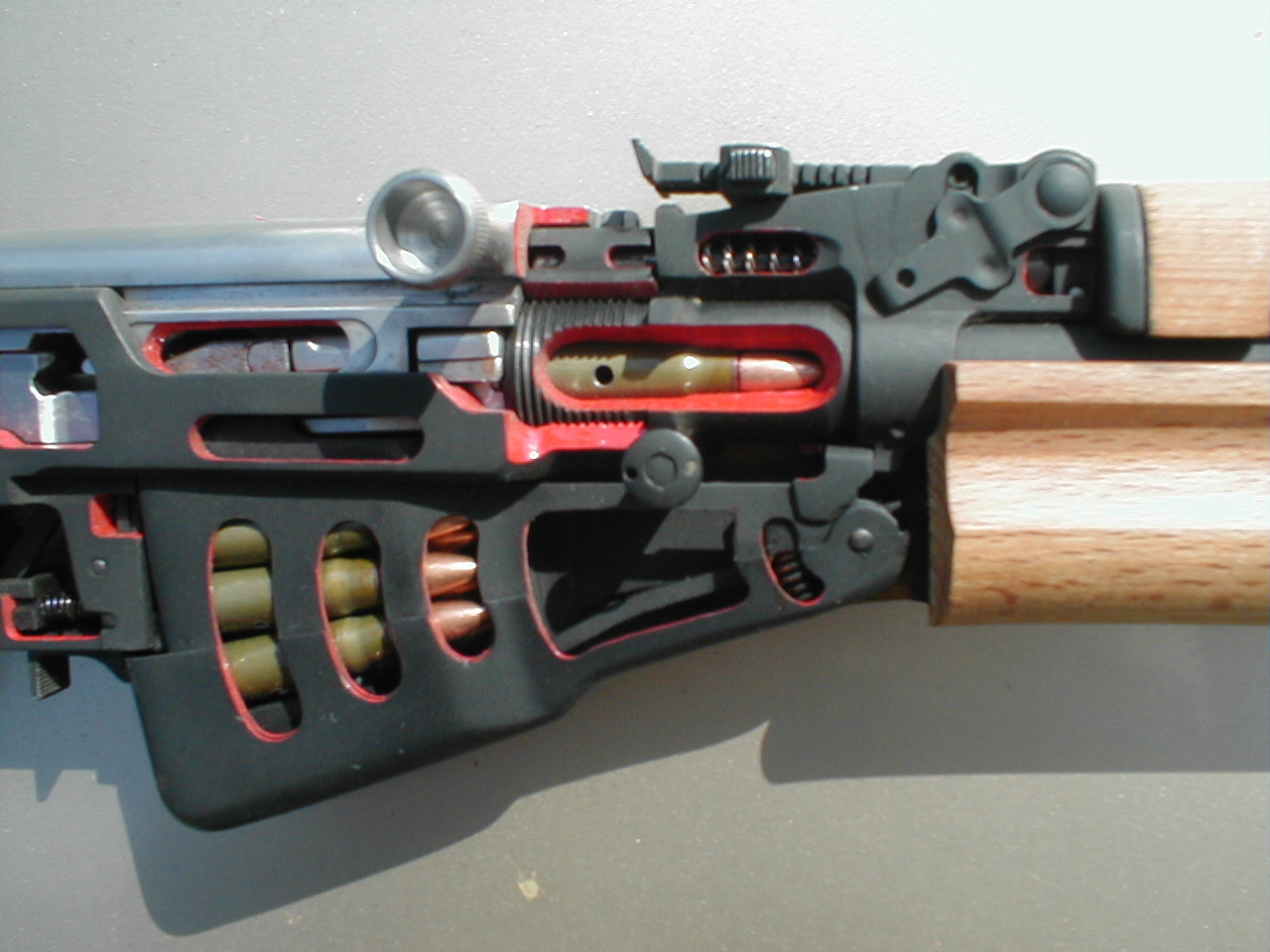 枪机复进时,其下方的推弹凸笋推弹向前,在导弹斜面的规正下,弹头部同时向上向内偏斜,使枪弹逐渐接近枪膛轴线而被推入弹膛。枪机复进快到位时,拉壳钩跳过弹底缘并卡入弹底环槽。