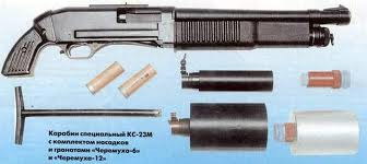 KS-23K及配用的两种口径的枪榴弹和发射杯,上面是“喷嘴6型”,下面是“喷嘴12型”
