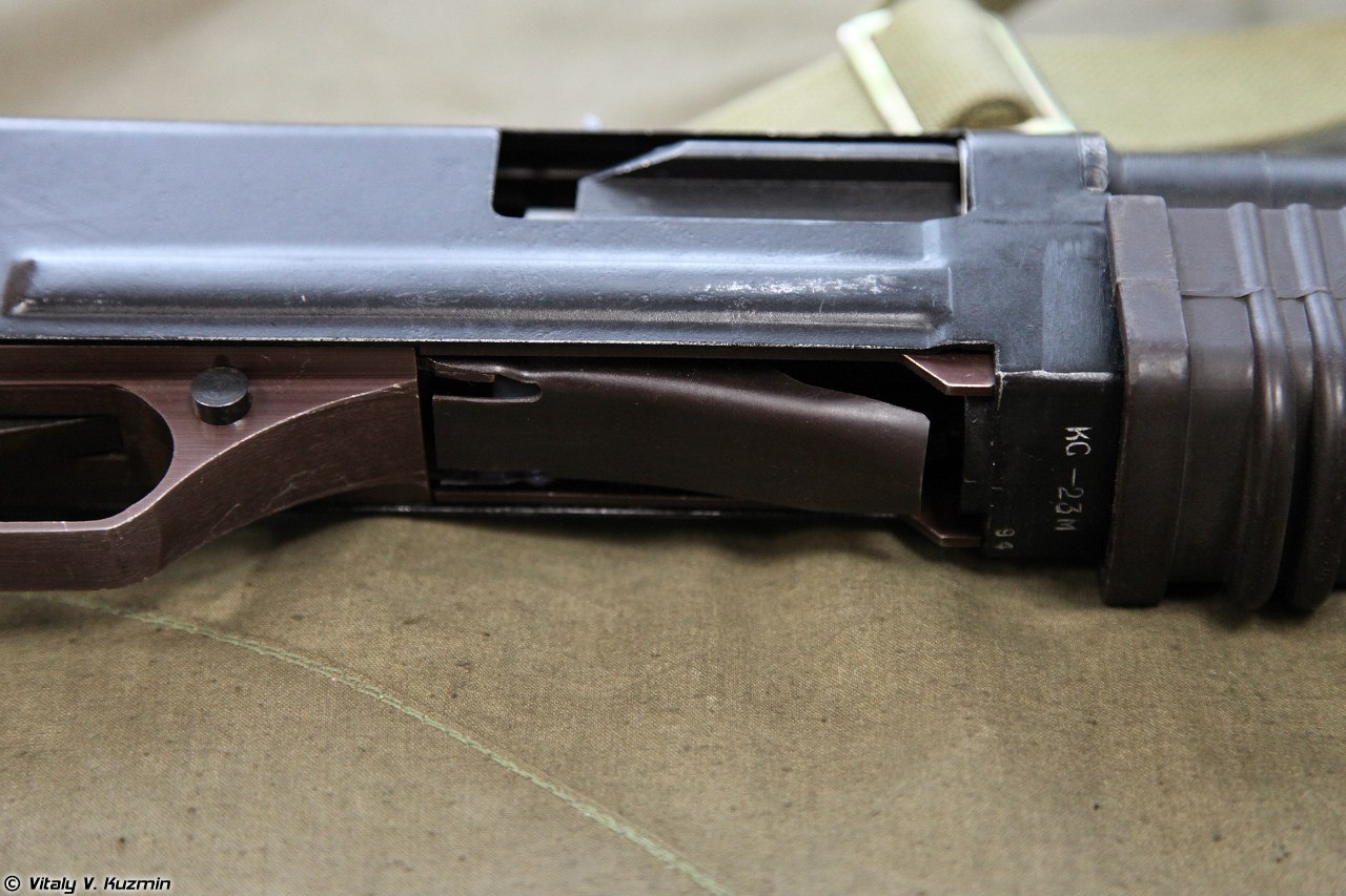 为了能在狭窄空间中使用,在1990年代又先后推出了两种改进型,一种是使用可拆卸枪托和截短枪管的KS-23M,一种是无托结构和盒形弹匣的KS-23K。