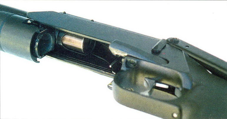 虽然管状弹仓在枪管上面,但该枪的装填方式与传统的泵动霰弹枪一样,也是通过底部的装填口装填。装填时把枪管向前推出,就能露出弹仓后部的装填口。