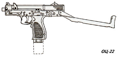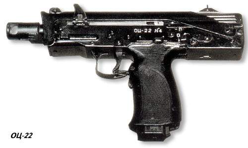 OTs-22采用包络式枪机、开膛待击,其原理与PP-93相似。枪身由钢板冲压而成,握把上方有快慢机,可选择单/连发射击;拉机柄位于机匣左侧,可向上折叠。由于该枪重心位置好重量也轻,因此可以单手射击。装备对象是装甲车组成员、飞行员或执法人员。最初说法认为该枪是专供出口的型号,因此发射西方通用的9×19mm派拉贝鲁姆弹,但后来有消息证实该枪是发射俄罗斯自己的9×19mm 7N21高膛压穿甲弹,而且在俄罗斯内也极少发现该枪有被使用,据说在俄罗斯的一些情报部门的特种部队极少量采用。