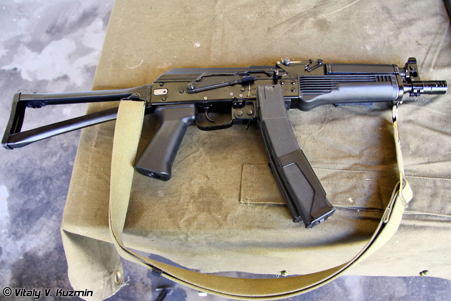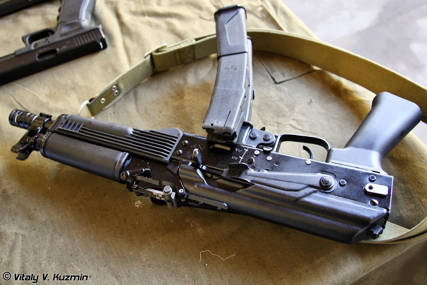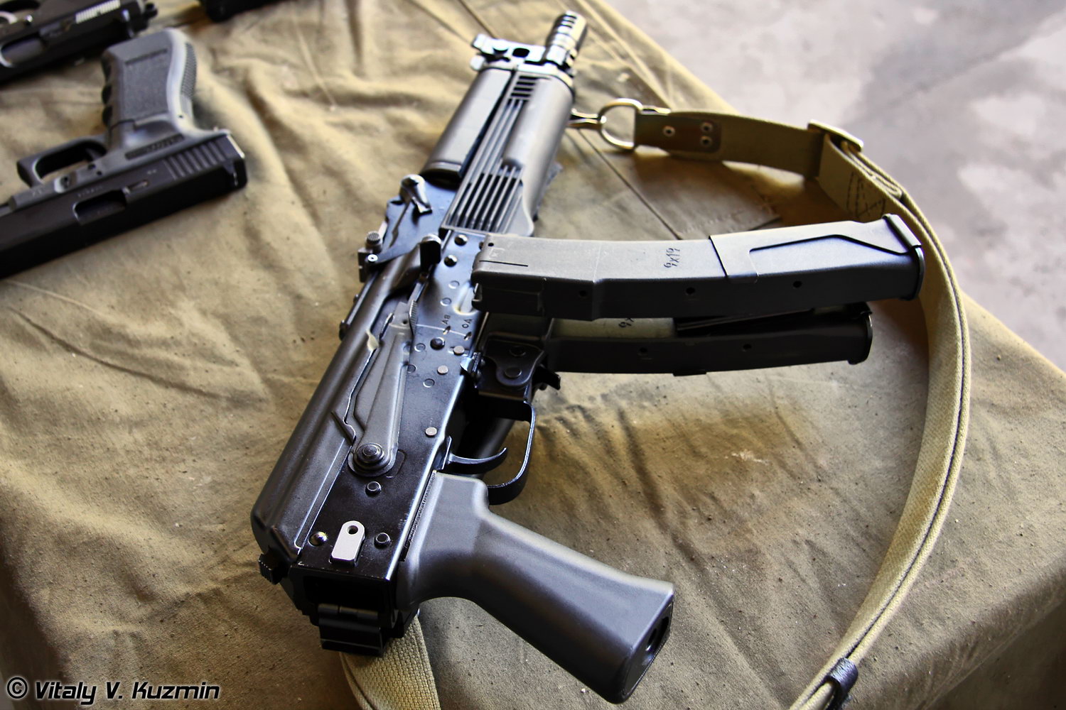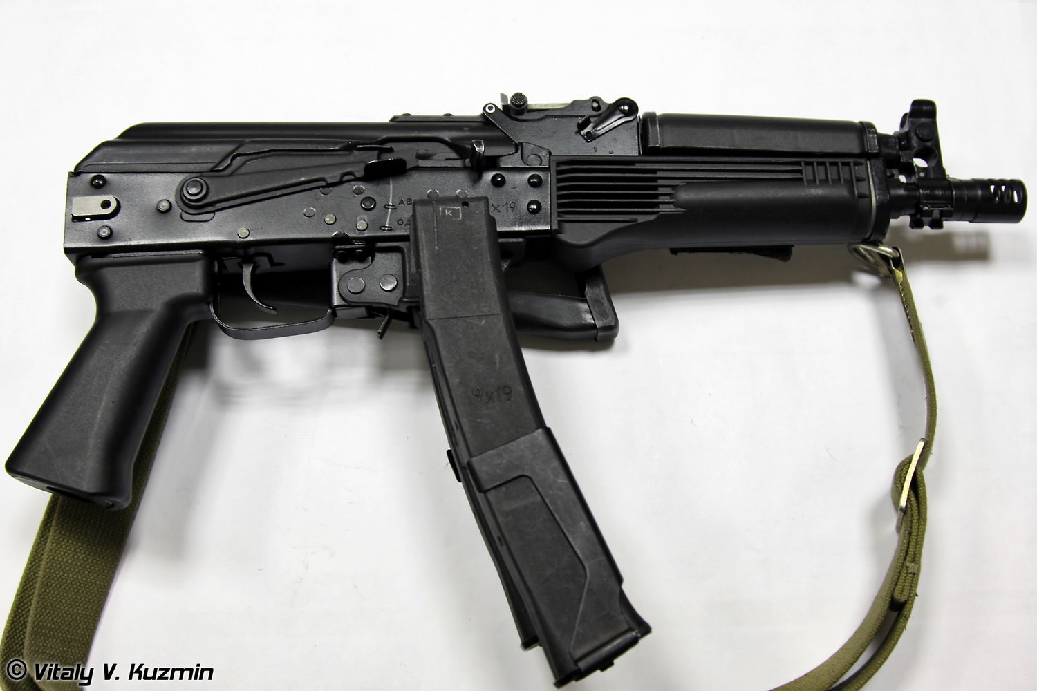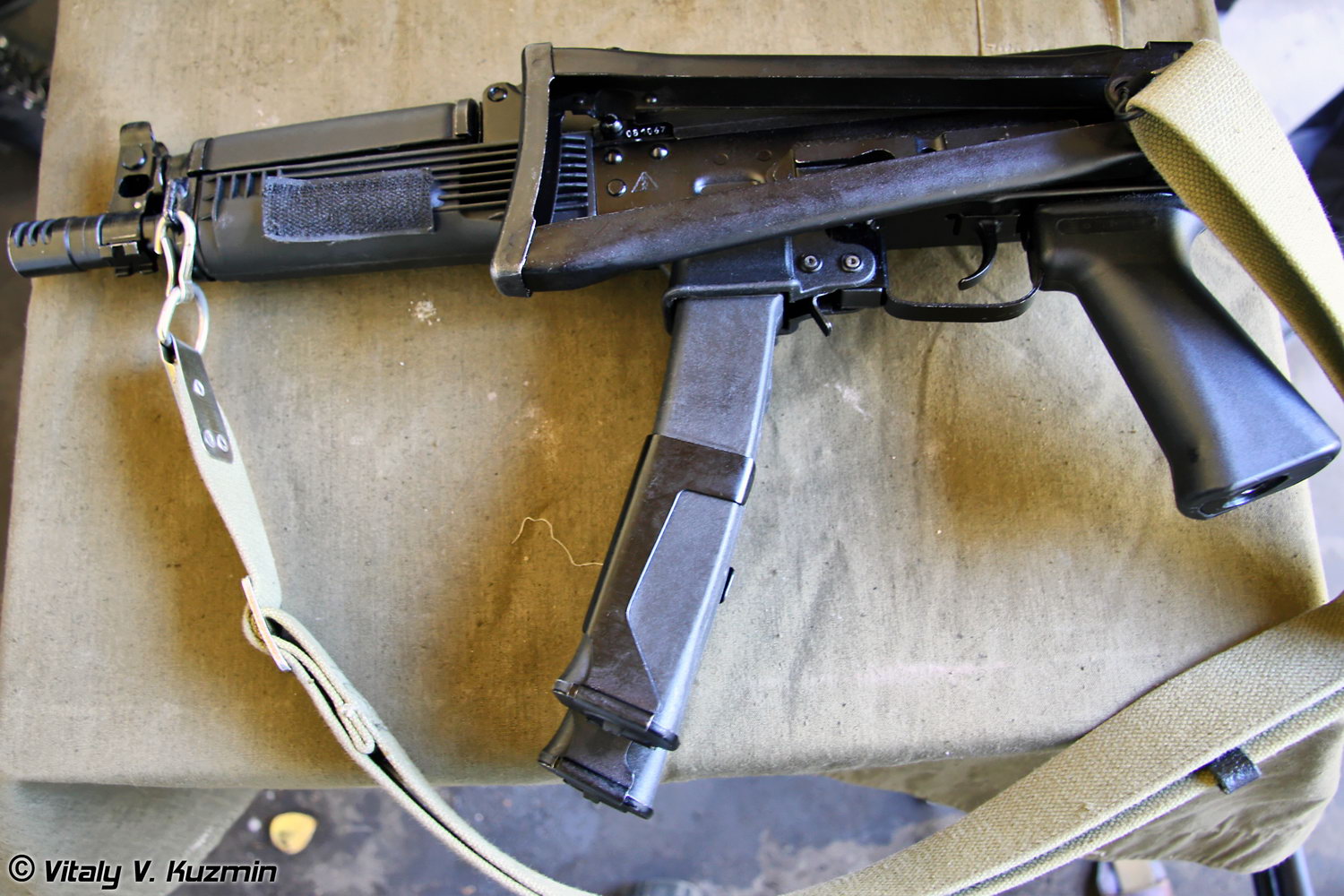“勇士”冲锋枪与AKS-74U有70%的零件通用,只是把自动原理改为自由式枪机,闭膛待击。由于9mm手枪弹的长度较短,因此机匣较短。弹匣为塑料外壳,直插式固定,因此机匣底增加了一个弹匣座。