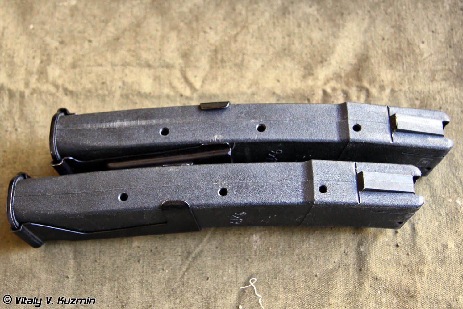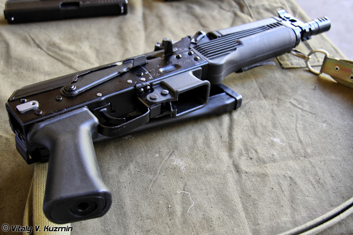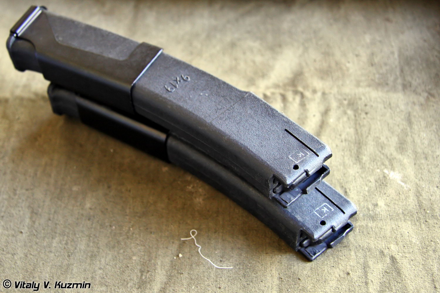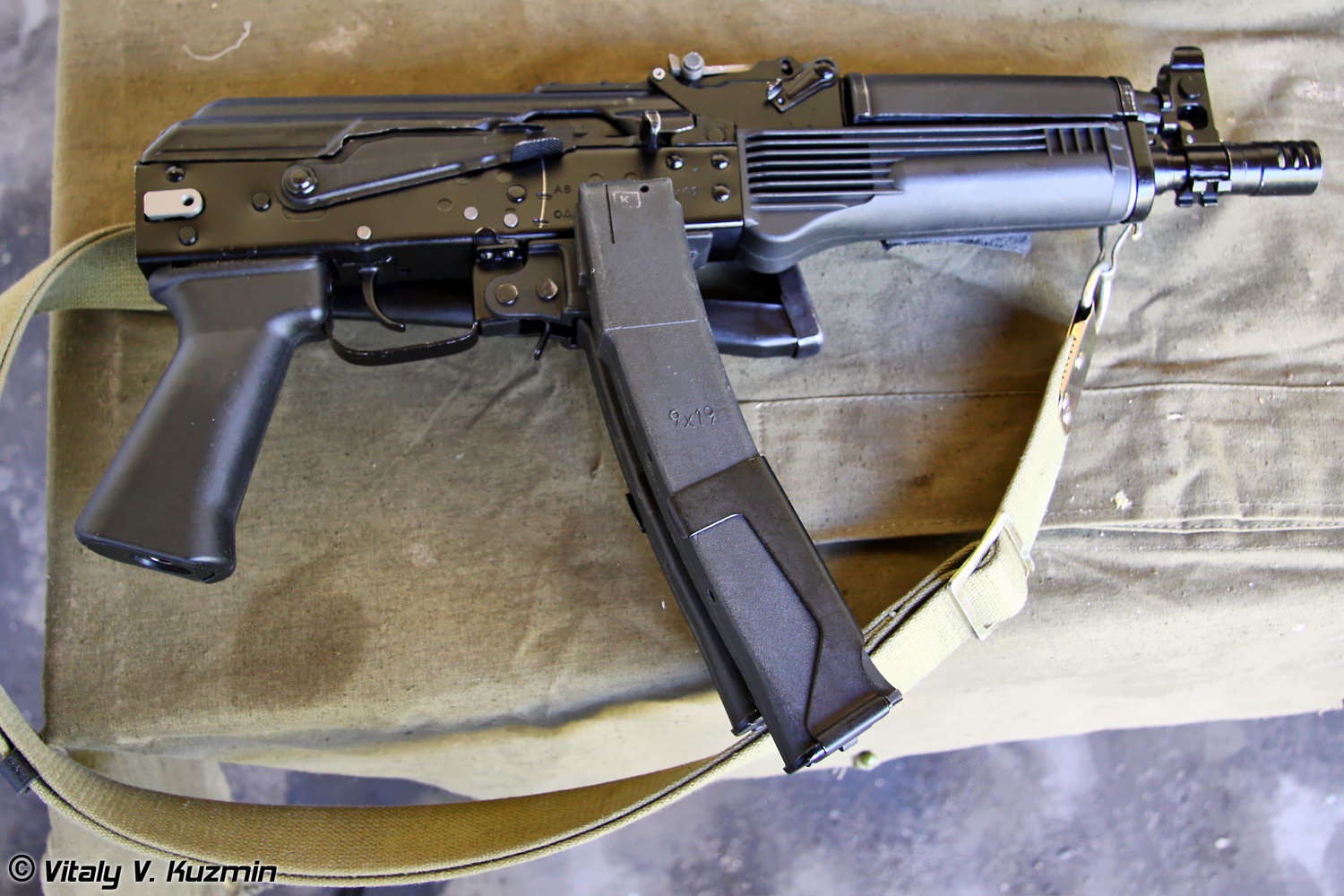 “勇士”冲锋枪与AKS-74U有70%的零件通用,只是把自动原理改为自由式枪机,闭膛待击。由于9mm手枪弹的长度较短,因此机匣较短。弹匣为塑料外壳,直插式固定,因此机匣底增加了一个弹匣座。