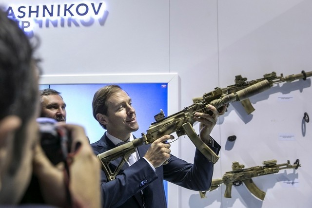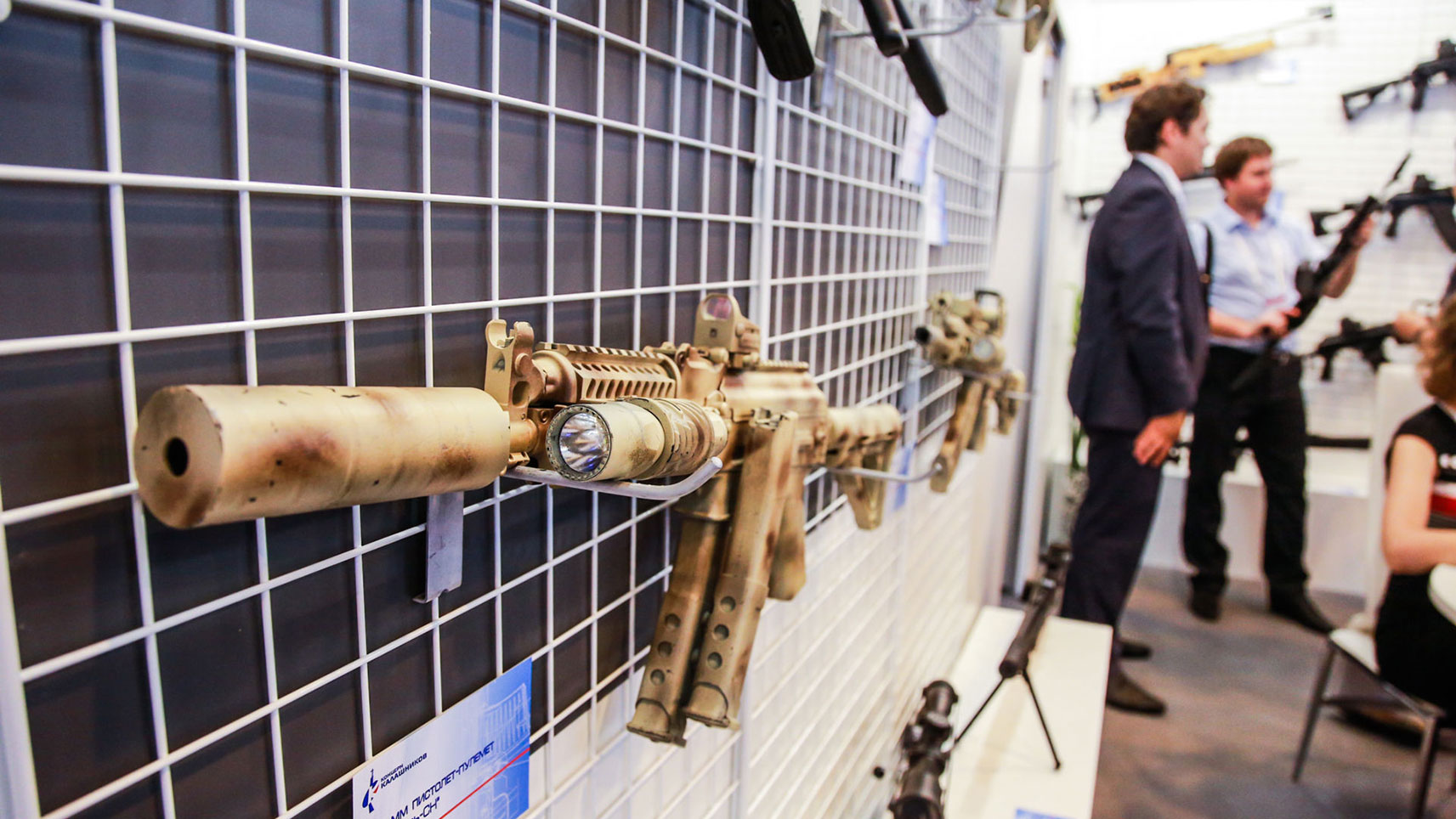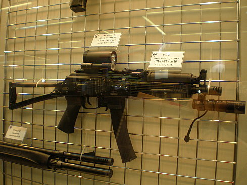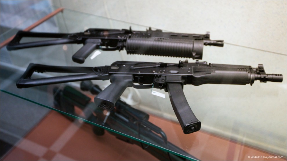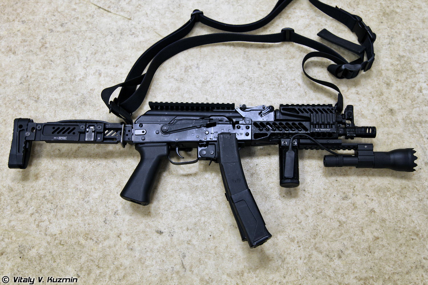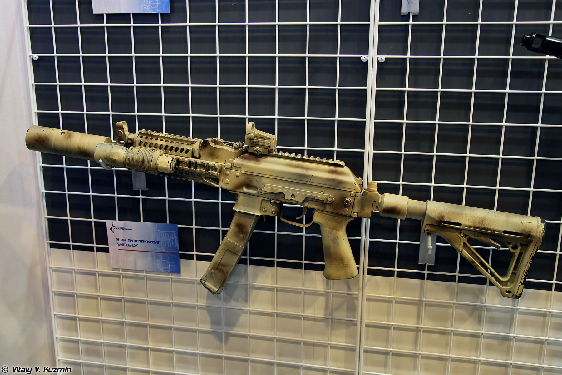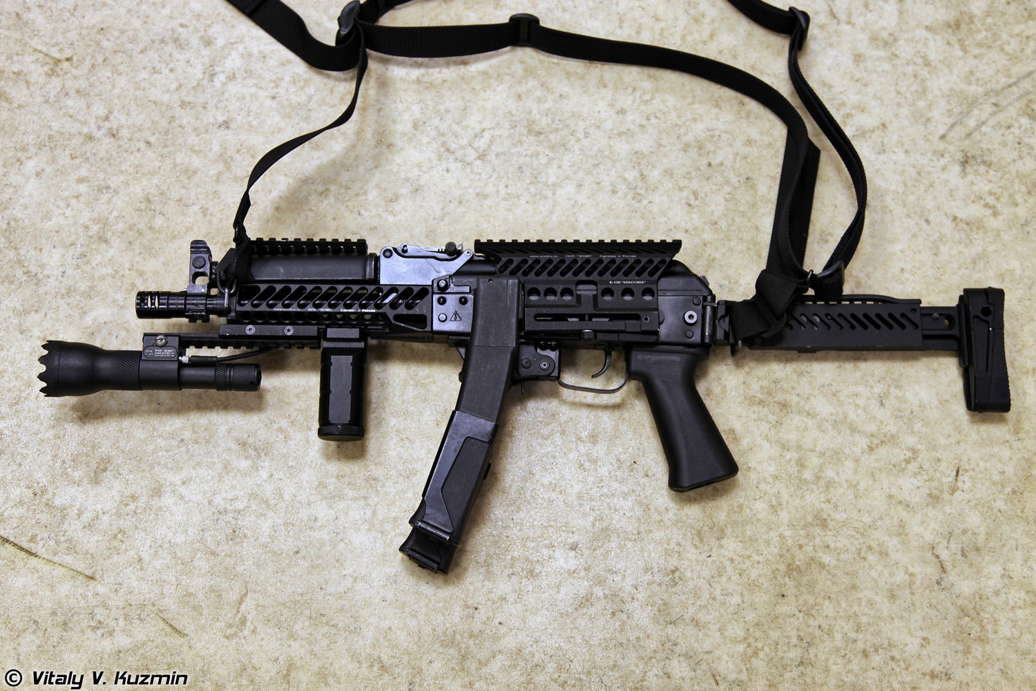 2014年国际军警装备展上,卡拉什尼科夫公司摊位所展出的西化改装“勇士”冲锋枪