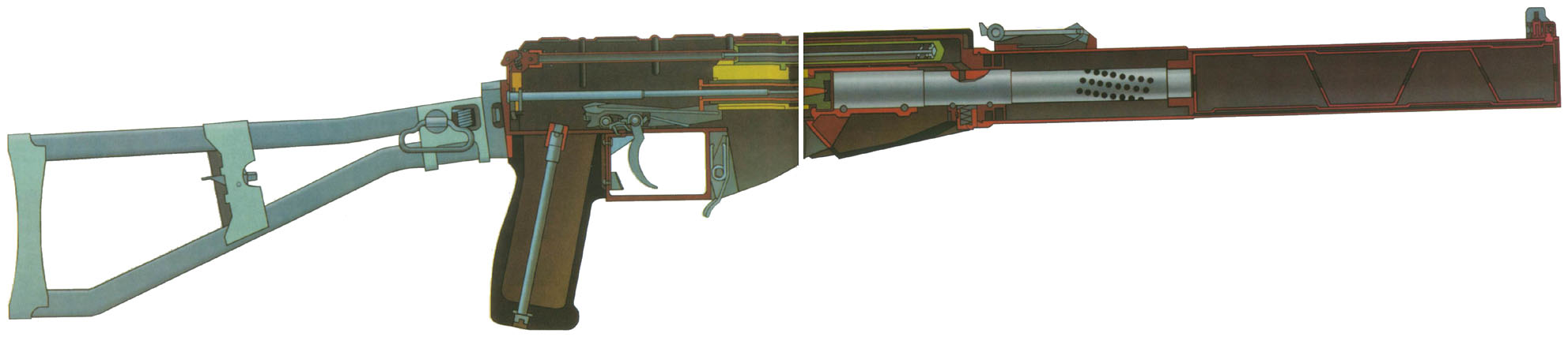AS和VSS都采用相同的整体式双室型消声器,通过发射特制的亚音速重型弹头,比起有效射程相当的微声武器具有更低的噪音,但弹头的终点效能更大。枪管上有一系列细小的泄气孔,位于枪膛的阴线上。射击时火药燃气通过泄气孔进入第一个气室内膨胀,第一个气室内绕着一些金属网,这些金属网阻缓了火药燃气的膨胀速度,从而降低了压力和温度,然后燃气再进入第二个气室二次膨胀,因此声音讯号大为减弱,只有在很近的距离才能听得到。武器可以选择单发或全自动发射而不会损坏消声器,消声器可以分解出来进行维护。