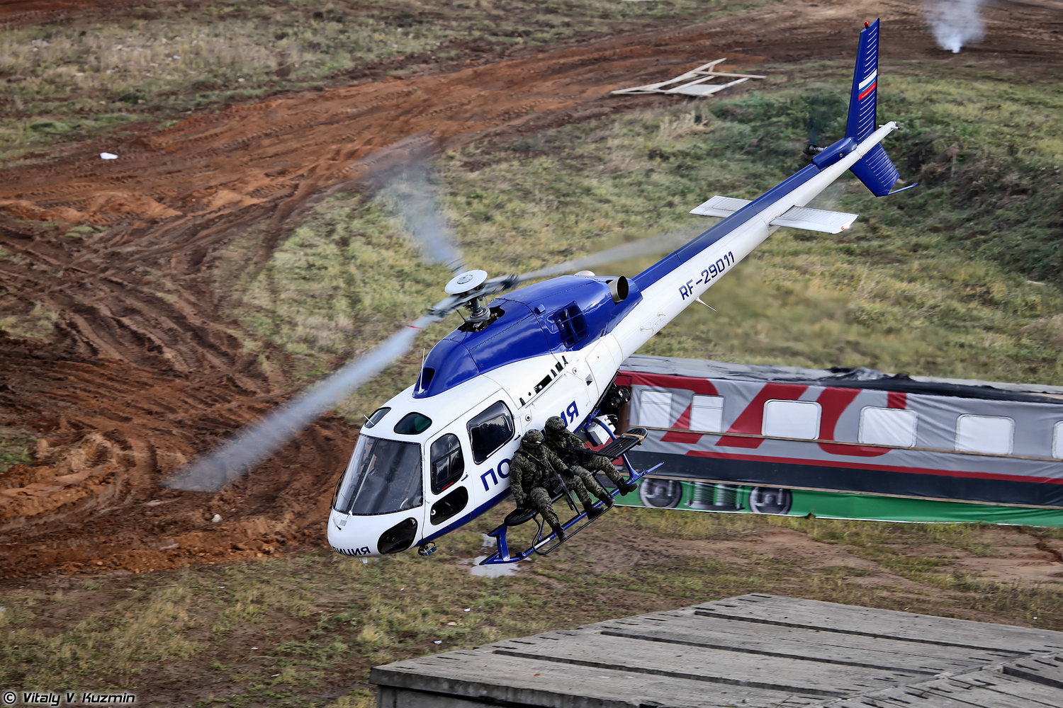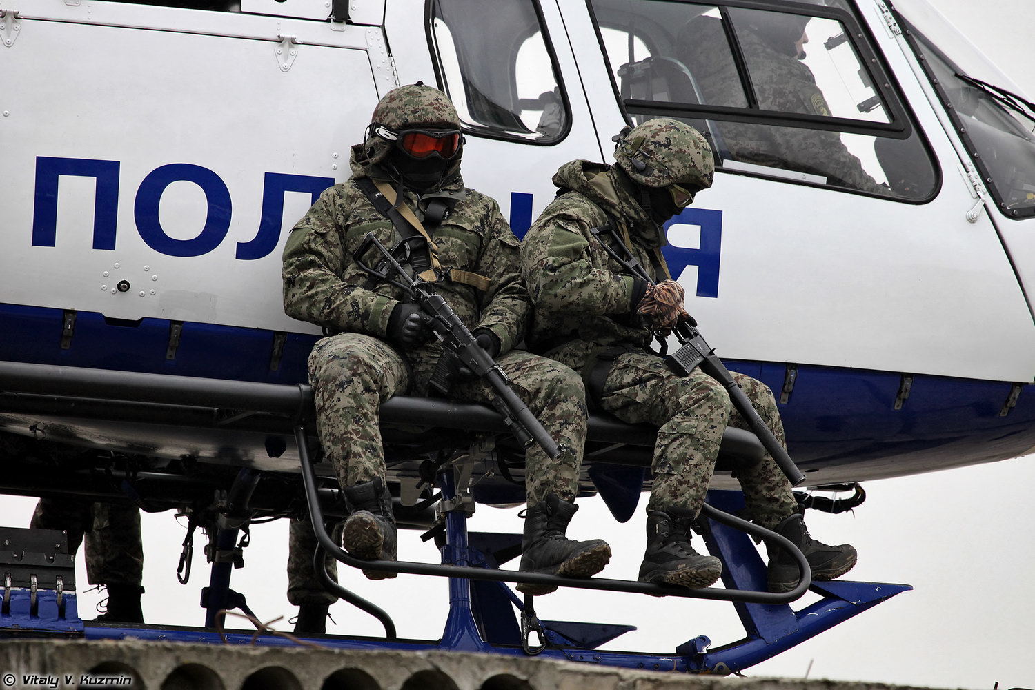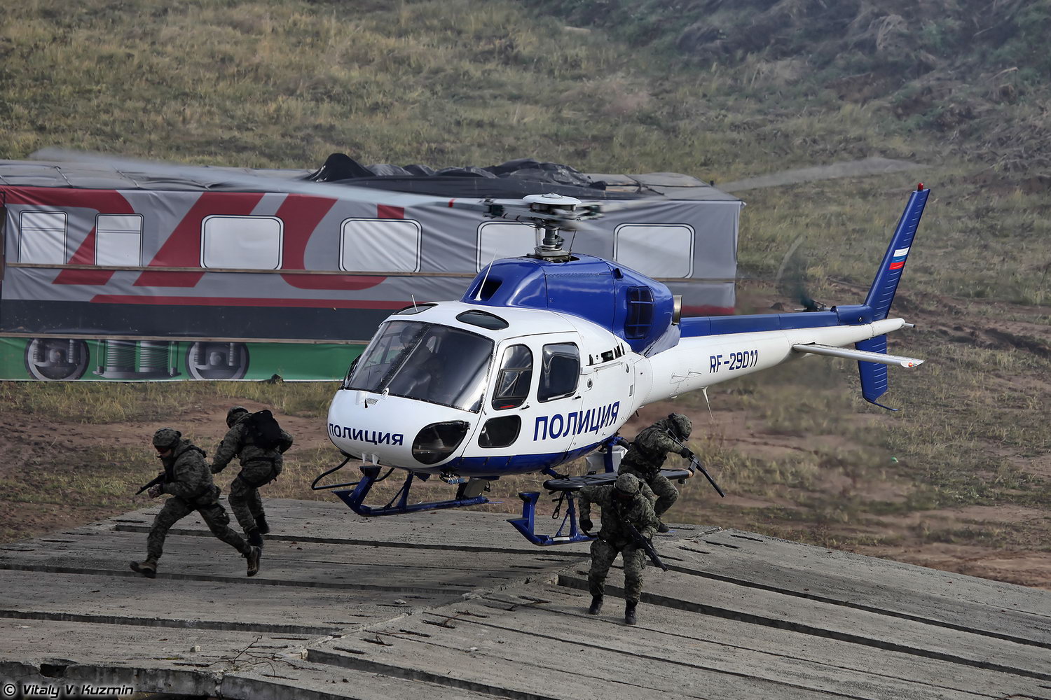 俄罗斯2013年国际军警装备展上进行表演的内务部特种部队,手持AS VAL乘坐AS355N双发小松鼠改装的特种运输直升机