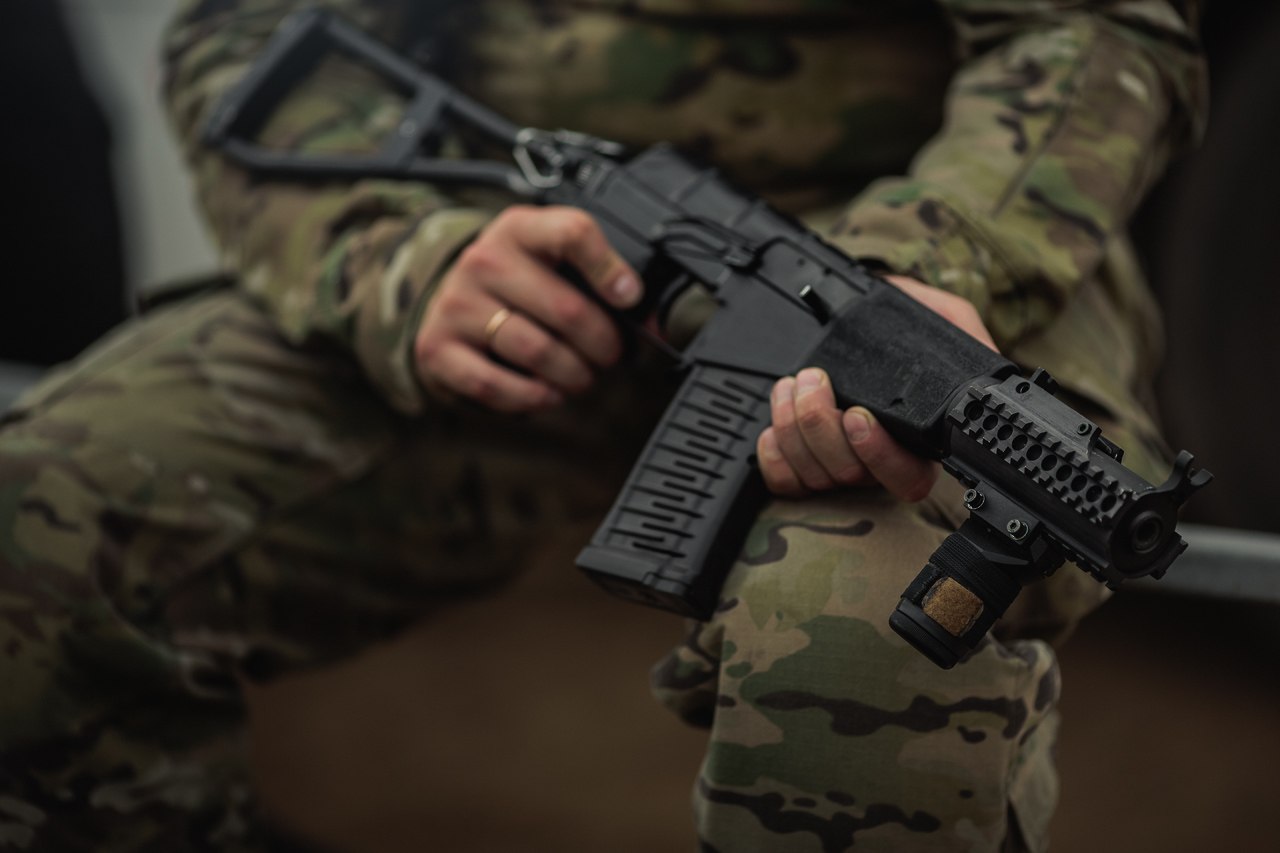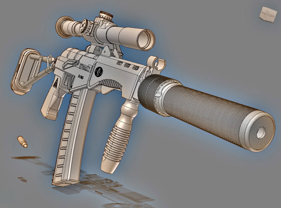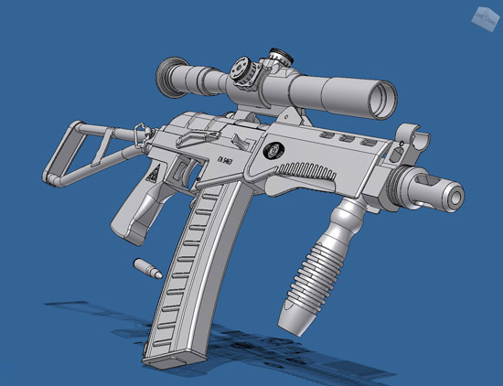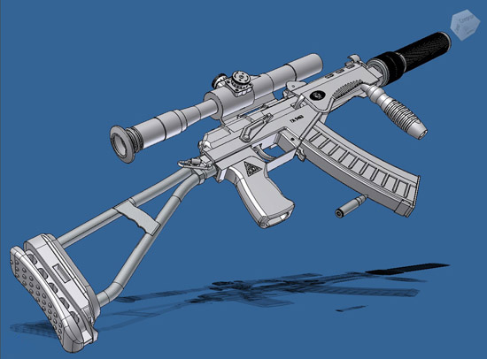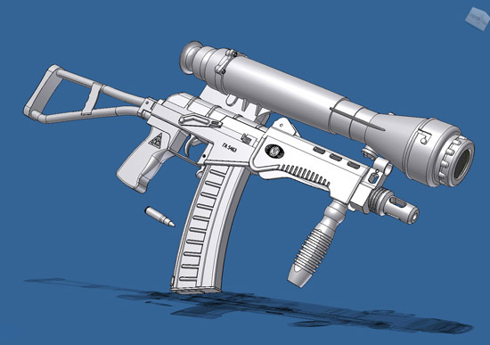 2012年初次公开的SR-3MP,原来的折叠枪托倒过来安装在握把底部,适合那些戴防弹面罩的头盔