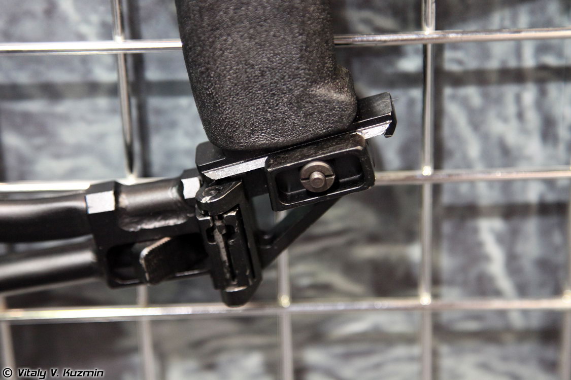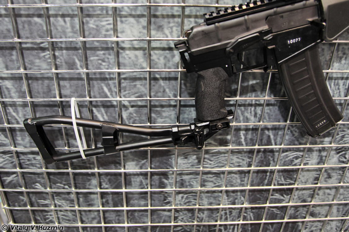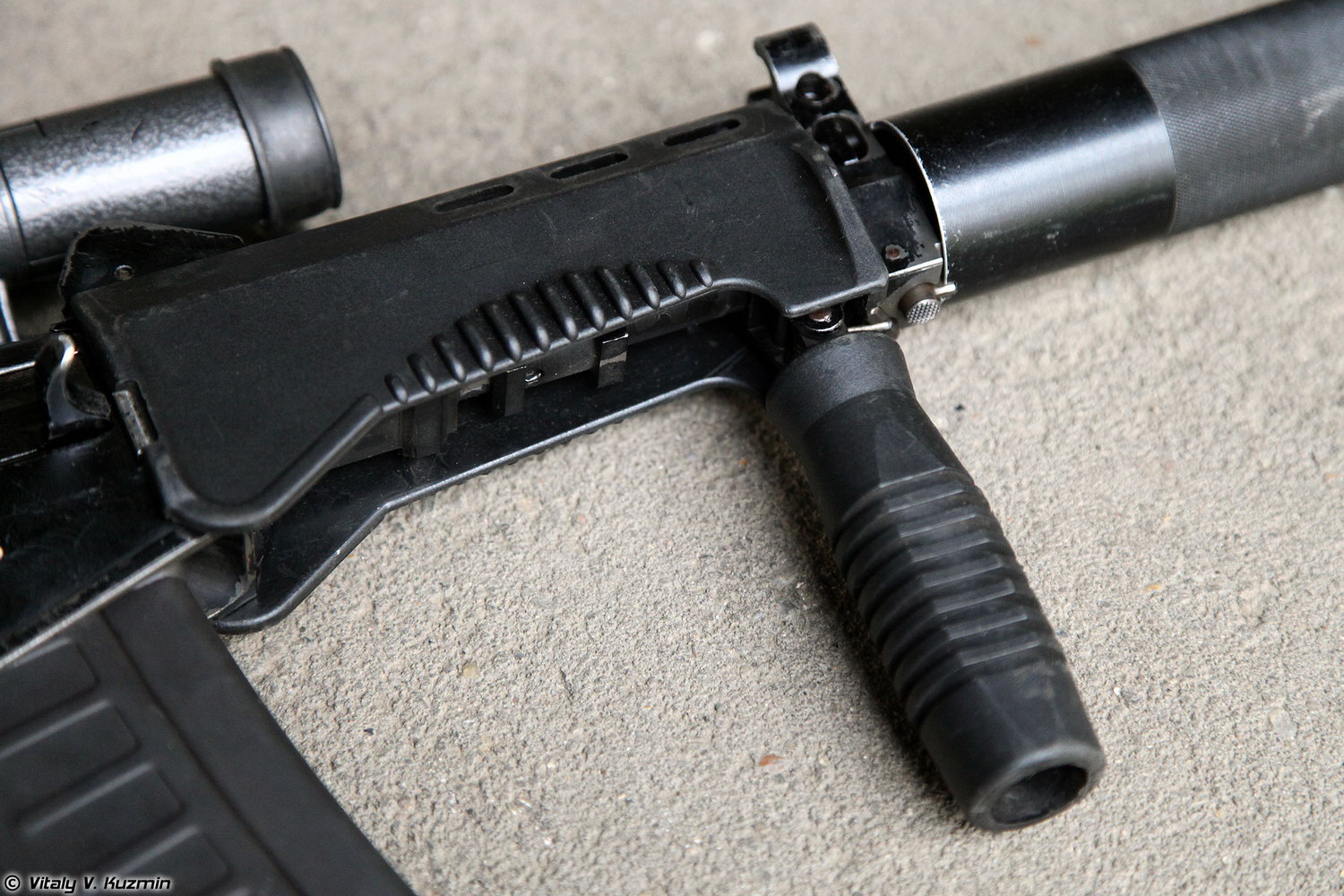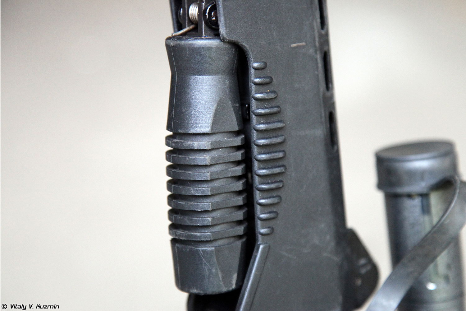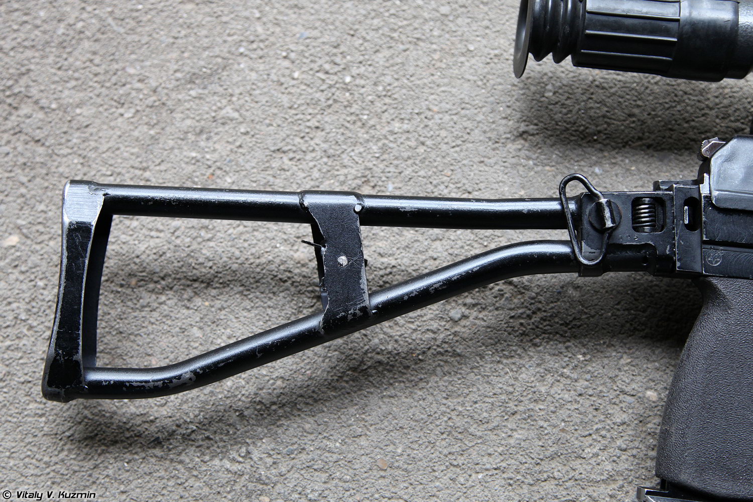 SR-3M安装了AS步枪的侧折叠枪托,由钢管和塑料托底板组成,不使用时折叠在枪的左侧。在护木下方还有一个可折叠的前握把。